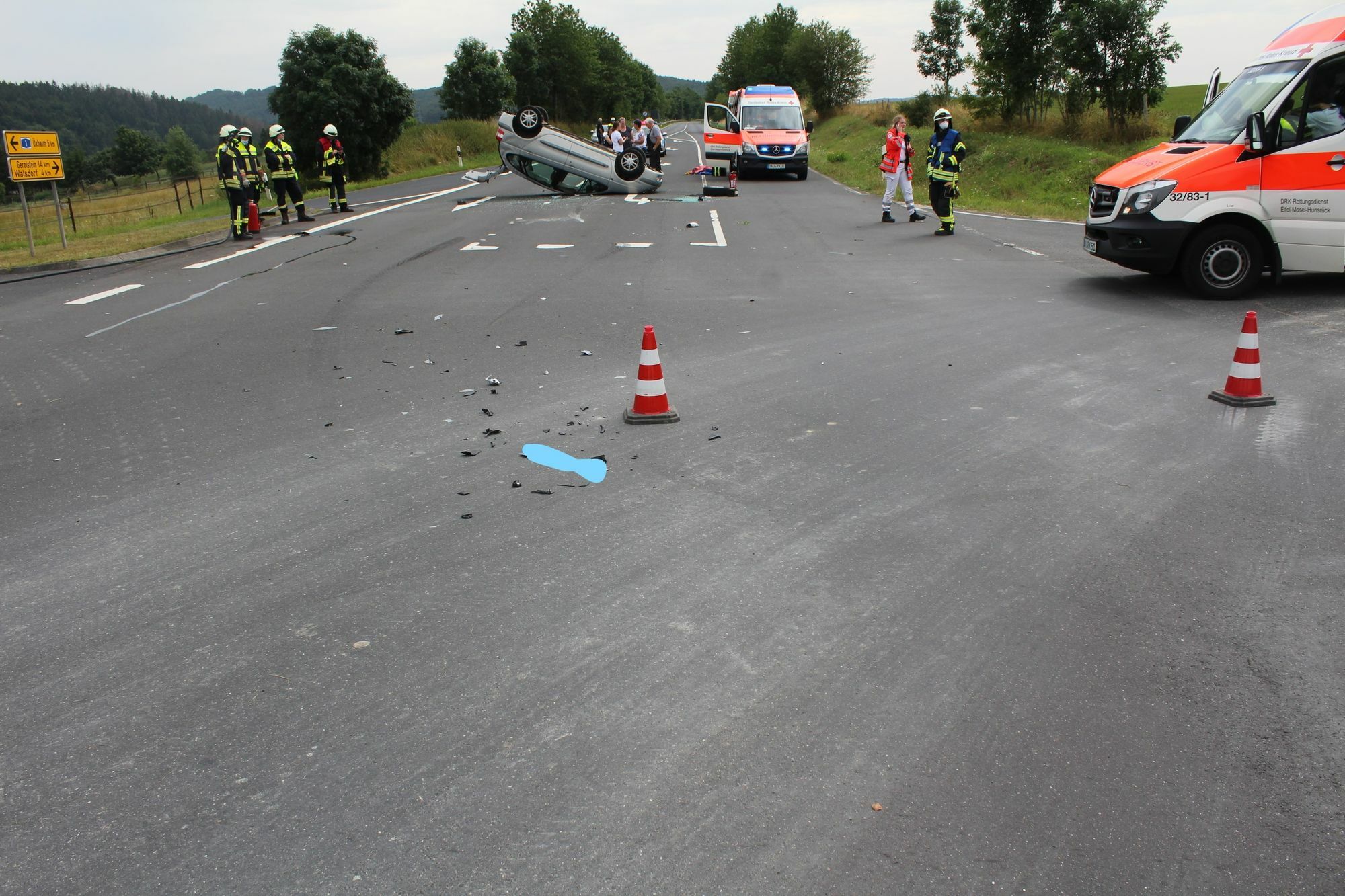 Am Donnerstag, 13. August, 14.40 Uhr, ereignete sich auf der L 10 Höhe Kerpen ein Verkehrsunfall, bei dem insgesamt drei Personen verletzt wurden. Ein 87-jähriger Mann auf dem Kreis Daun befuhr mit seinem Auto die K 59 aus Berndorf kommend in Richtung der L 10 und beabsichtigte, nach links auf die L 10 in Richtung Üxheim einzubiegen. Beim Abbiegen übersah er ein aus Richtung Üxheim kommendes Fahrzeug und es kam zur Kollision der beiden Autos. Durch die Wucht des Aufpralls überschlug sich das aus Richtung Üxheim kommende Fahrzeug. Der 31-jährige Fahrer dieses Autos wurde schwer verletzt und mittels Rettungshubschrauber in ein Krankenhaus gebracht, der Unfallverursacher und seine Begleiterin wurden leichtverletzt in ein Krankenhaus gebracht. An beiden Fahrzeugen entstand erheblicher Sachschaden. Im Einsatz befanden sich die FFW Hillesheim, Kerpen, Üxheim und Leudersdorf, zwei Rettungswagen, ein Notarzt, ein Rettungshubschrauber und eine Streife der Polizeiinspektion Daun.