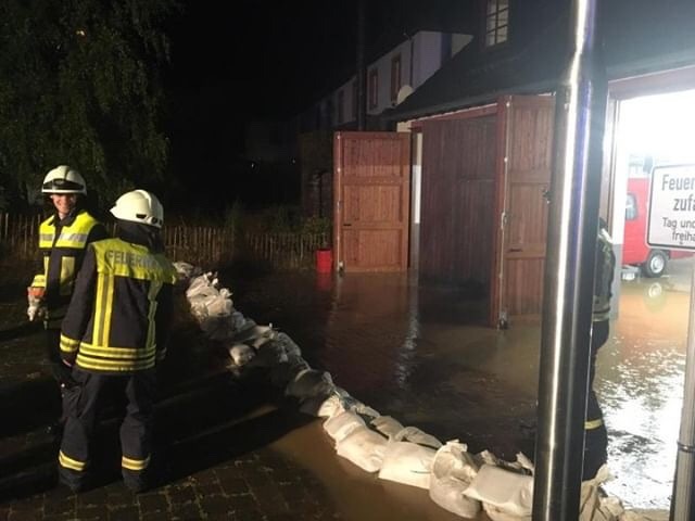 In der Nacht von Samstag, 27. Juli, auf Sonntag, 28. Juli, sorgte Starkregen für einen Großeinsatz mehrerer Wehren in Niederehe. Ab 2.30 Uhr kam es laut der Freiwilligen Feuerwehr Niederehe in der Ortslage Niederehe zu mehreren vollgelaufenen Kellern und Unterspülungen, infolgedessen auch eine Straßenlaterne an einer Brückenbaustelle umkippte. Hinzu kam, dass sich mehrere Kanaldeckel aufgrund der Wassermassen anhoben. Im ehemaligen Reiterhof stand der Kellergeschoss ebenso unter Wasser wie in mindestens zehn weiteren Wohnhäusern. Besonders schlimm für die Niedereher Wehrleute: Das eigene Feuerwehrgerätehaus stand ebenso knöchelhoch im Wasser und Schlamm. Unterstützt wurde die Freiwillige Feuerwehr Niederehe unter Einsatzleitung des neuen Wehrleiters der VG Gerolstein, Sascha Löbens, von den Wehren aus Leudersdorf, Üxheim und Hillesheim sowie Lissendorf mit weiteren Hochwasserschmutzpumpen. Als letzte Wehr konnte die Feuerwehr Niederehe nach Reinigung des eigenen Gerätehauses gegen 15 Uhr wieder einrücken. Weitere Einsatzstellen lagen in Ahütte, Kerpen, Stroheich und Zilsdorf, so Sascha Löbens. Somit waren in der Nacht auf Sonntag die Wehren aus Hillesheim, Kerpen, Leudersdorf, Niederehe, Oberehe, Stroheich, Üxheim, Zilsdorf sowie die Feuerwehr-Einsatzzentrale Hillesheim im Einsatz.