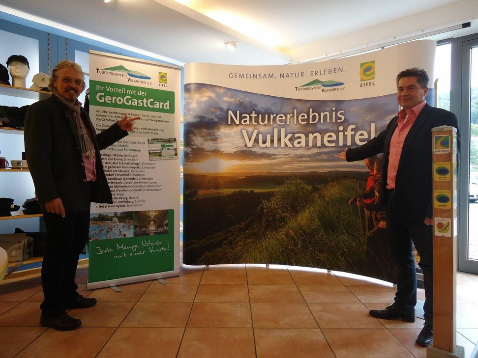 Universell einsetzbar, platzsparend in der Aufbewahrung und in wenigen Minuten aufzubauen - das sind nur einige Merkmale des neuen hochwertigen Werbewand-Faltdisplays, das der Tourismusverein Vulkaneifel angeschafft hat, um zukünftig auf Messen und Events für die Ferienregion Gerolsteiner Land zu werben. Das elegante mobile System ist ein echter Hingucker und vervollständigt den Auftritt der Ferienregion auf publikumswirksamen Events. Im Tourismusverein Vulkaneifel sind 16 touristische Vermietungsbetriebe ehrenamtlich organisiert. Mit Einführung der GeroGastCard 2011, die jeder Gast während seines Ferienaufenthaltes gegen eine geringe Gebühr von 1 €/Nacht und Person erhält, werden den Gästen viele Vorteile und Vergünstigungen, wie z.B, der freie Eintritt ins Hallen- und Freibad und das Naturkundemusem, gewährt. Die so generierten Zusatzeinnahmen investiert der Verein in die touristische Infrastruktur, wie z.B. in neue Sitzmöglichkeiten an den beliebten Wanderwegen oder jüngst in die Anschaffung der mobilen Werbewand für die Ferienregion Gerolsteiner Land. Erstmals zum Einsatz kommt das neue Faltdisplay während des SWR4-Wandertages am Sonntag, 27. September, auf dem Veranstaltungsgelände vor der Tourist-Information in der Brunnenstraße 10.