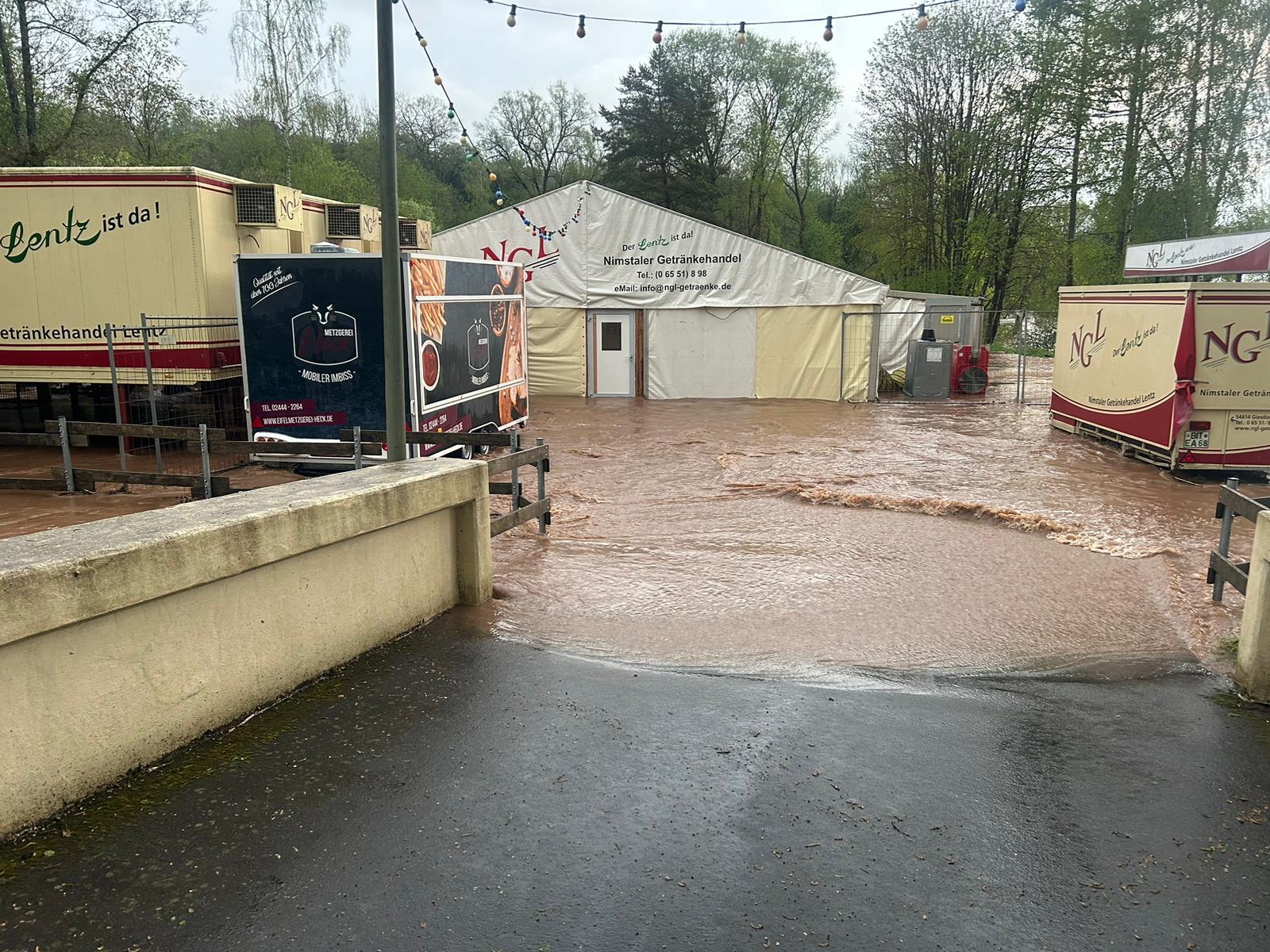 Erwischt hat die Flut auch das Festzelt, in dem an diesem Wochenende die Glaadter Kirmes stattfinden soll. Sven Simonis, Vorsitzender des Kirmesvereins Glaadt, ist als Helfer vor Ort: »Heute findet hier nicht, wie ursprünglich geplant, die Kirmes statt. Der Auftritt der beiden DJ für heute Abend wurde abgesagt.« Auch am morgigen Samstag, 4. Mai, wird es eine Änderung geben: Nach dem Hahneköppen am Nachmittag findet normalerweise ein Umzug durch den Ort statt. Dieser wurde ebenfalls abgesagt. Simonis: «Wir können keinen Umzug veranstalten, wenn hier Menschen von der Überschwemmung betroffen sind.«