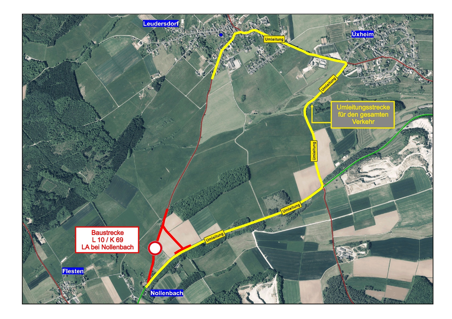 Wegen der Umgestaltung des Knotenpunktes L 10/K 69 mit Anbau eines Linksabbiegestreifens bei Nollenbach, kann es in der Zeit vom 27. April bis voraussichtlich zum 31. Juli zu Behinderungen für den Verkehr kommen. Das teilt der Landesbetrieb Mobilität Gerolstein mit. Die Straßenbauarbeiten im Zuge der L 10 erfolgen unter einer Einengung der Fahrbahn mit einer Lichtsignalanlage. Die Straßenbauarbeiten im Zuge der K 69 zwischen dem Ortsende Leudersdorf und Nollenbach können in dieser Zeit nur unter einer Vollsperrung für den Verkehr verrichtet werden. Eine Umleitungsstrecke für den Verkehr wird ab der Einmündung K 74/K 69 in Leudersdorf über die K 69 – K 74 – L 10 bis zur Einmündung L 10/K 69 bei Nollenbach, und umgekehrt, umgeleitet.