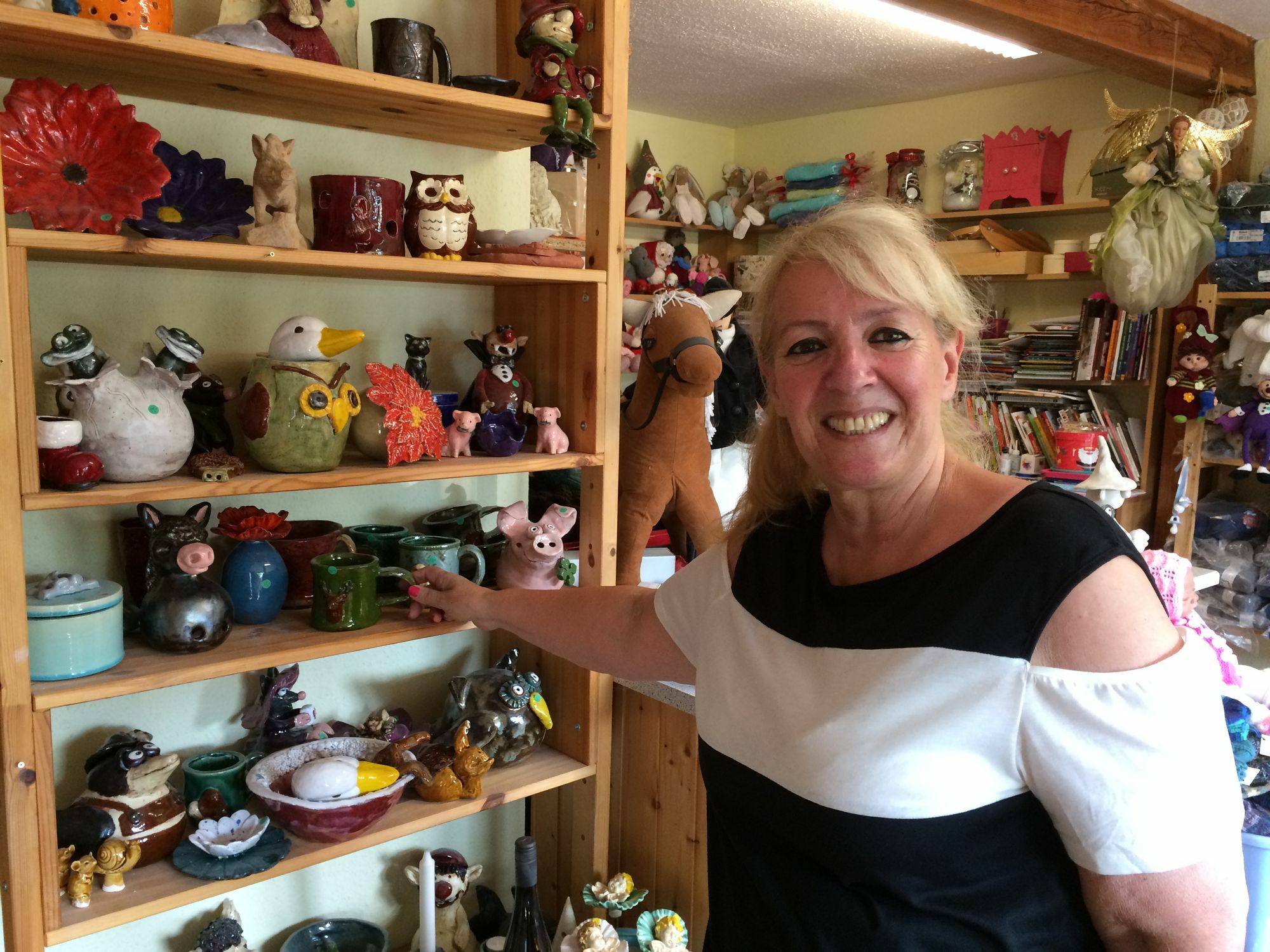 »Ich gestatte mir, auch Fehler zu machen, und wenn etwas schief geht, fange ich einfach von vorn wieder an«, beschreibt Erika Well ihre autodidaktische Methode, bei der viel Fingerspitzengefühl im Umgang mit dem Material und Geduld beim Trocknen und Brennen gefragt ist. Dabei bringt sie durchaus auch eine Portion nüchternen Perfektionismus mit. »Ich war Kauffrau und im Chefsekretariat einer Bauabteilung«, schildert sie ihr ganz normales Berufsleben in Köln, bevor sie in der Eifel Gelegenheit bekam, sich intensiver ihrer Begabung zu widmen. »Die Figuren habe ich nebenbei für Freunde und Familie gemacht.« Eine kreative Arbeit ohne Leistungsdruck und ohne Serienproduktion soll es auch jetzt bleiben. Auf dem Kelberger Kunsthandwerkermarkt will sie erstmals ihre Keramiken und Textilkunst auch außerhalb ihrer kleinen Werkstatt präsentieren.