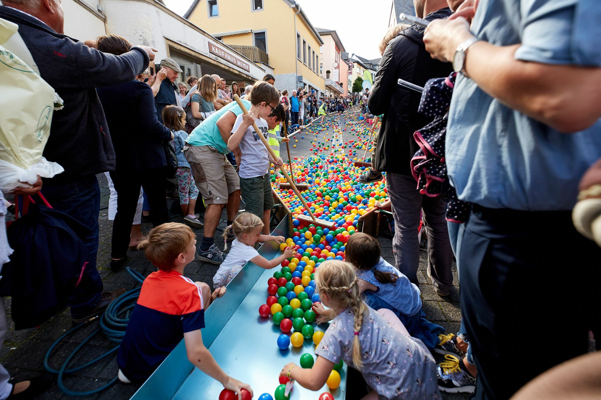 Ab 17.30 Uhr schließlich kullern die bunten Bälle über Asphalt und Kopfsteinpflaster. Jeder Ball ist mit einer Nummer versehen. Seit Anfang August werden in zahlreichen Dauner Geschäften Lose ausgegeben, auf denen jeweils eine der Nummern vermerkt ist. Alle Gewinnerbälle werden sowohl auf der Homepage zum Bällerennen unter www.dauner-baellerennen.de als auch in allen teilnehmenden Geschäften veröffentlicht. Bereits jetzt können auf der Homepage die Lose registriert werden. Die Gewinne können ab dem 30. August gegen Vorlage der Lose im Dauner Forum abgeholt werden.
