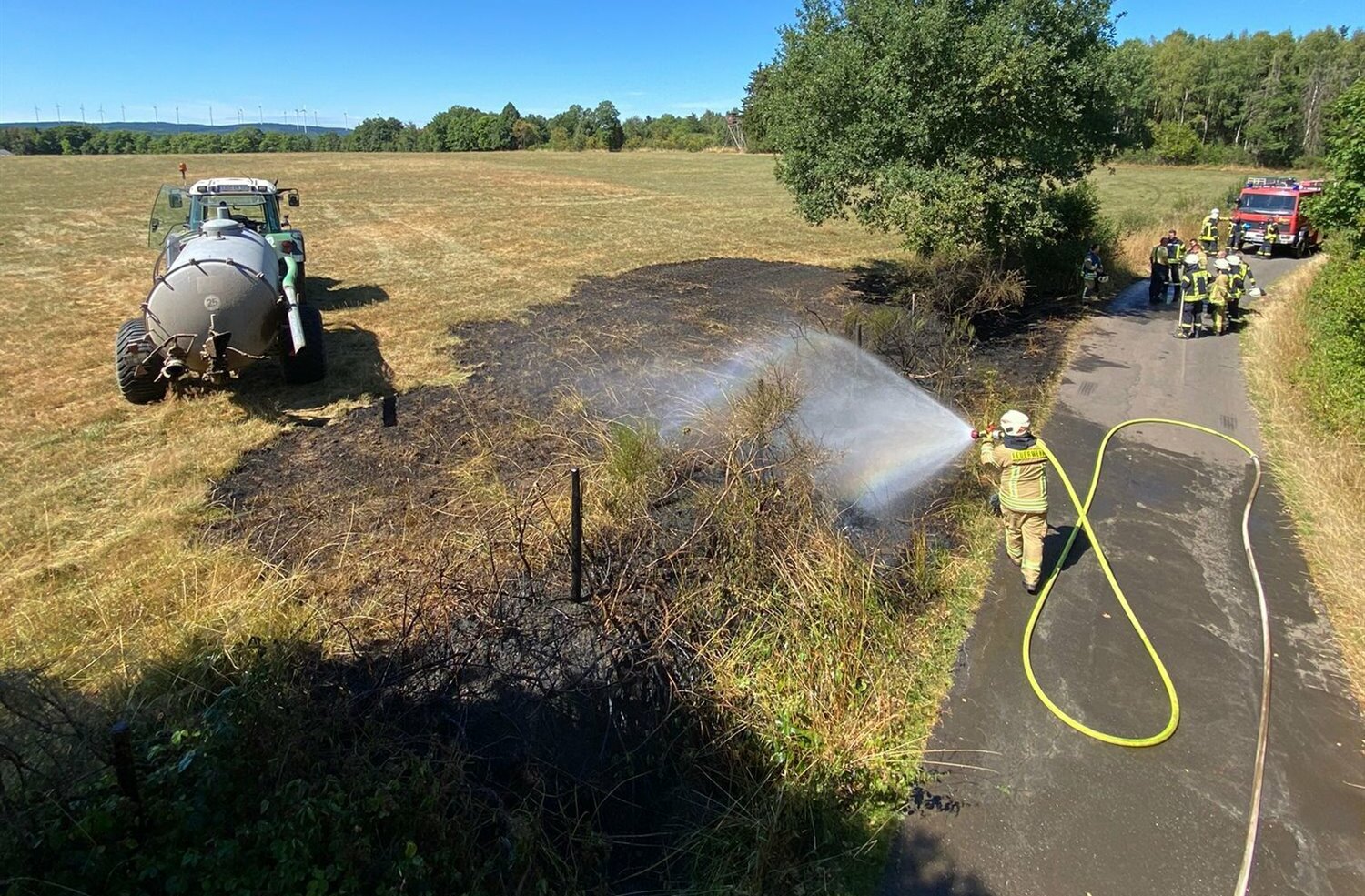 Derzeit werden die Feuerwehren durch etliche Flächenbrände auf Trab gehalten. Der Gerolsteiner Wehrleiter bemängelt fehlende Unterstützung des Landes. Johannes Mager GEROLSTEIN. Nahezu täglich rücken die Feuerwehren im Landkreis Vulkaneifel derzeit zu Bränden aus. Aufgrund der anhaltenden Trockenheit müssen sie regelmäßig Flächenbrände auf Feldern oder an Waldrändern löschen. Am vergangenen Samstagmittag, 30. Juli, bekämpften die Einsatzkräfte der Verbandsgemeinde Gerolstein sogar zwei Brände gleichzeitig. Zwischen Stadtkyll und der Landesgrenze zu Nordrhein-Westfalen brannte eine Wiesenfläche von etwa 100 Quadratmetern. Durch das Eingreifen eines ortsansässigen Landwirtes wurde der Brand schnell gelöscht, sodass die 34 Wehrleute aus Stadtkyll, Kerschbach und Jünkerath nur noch Nachlöscharbeiten durchführen mussten. Auch auf dem Sportplatz in Mürlenbach löschten 22 Einsatzkräfte der Wehren Mürlenbach und Birresborn nur noch durch einen Grill entfachte Glutnester ab. Zwei Tage zuvor war schon ein größerer Flächenbrand im Bereich der Grillhütte in Gerolstein entfacht worden.