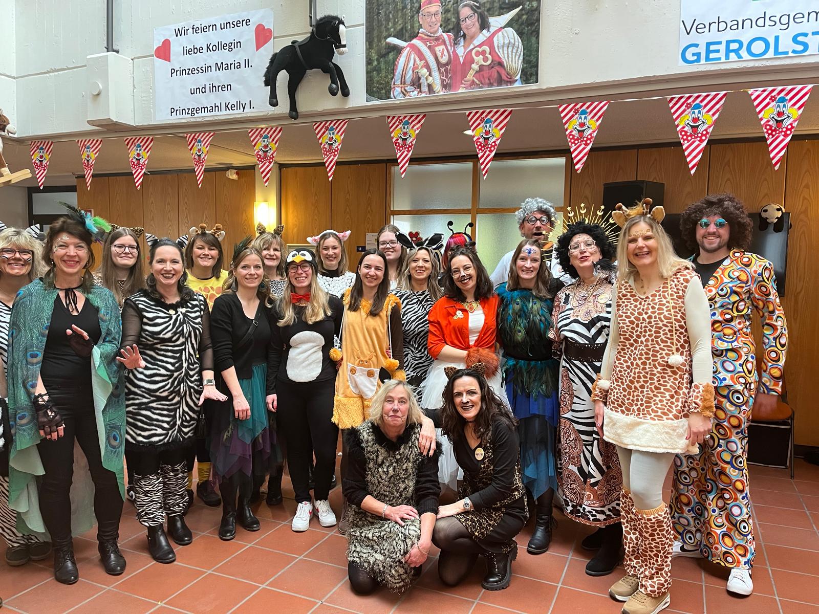 Um die Rathaus-Obermöhne, Andrea Hoffmann (3. von rechts), versammelte sich die Gerolsteiner Möhnenschar, allesamt als wilde Tiere verkleidet.