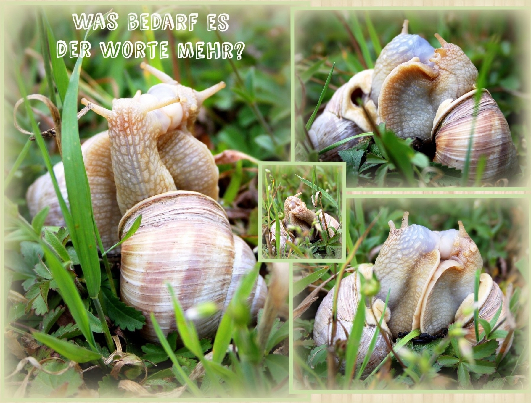 Schon bemerkenswert, wie sich diese kleinen tapferen Bauchfüßler so ganz ohne Routenplaner durch die hiesige Walachei schleimen. Inklusive ihrer Eigentumswohnung, welche sie nonstop in ihrem allzeit geschulterten Hartschalenrucksack buckeln. Die beiden, zwischen sanft schaukelnden Grashalmen geparkten, Rennsemmeln, erinnern mich auf eigentümliche Weise an Einsiedlerkrebse, die ebenfalls ihre Rückzugshöhle immer im Gepäck mitschleifen. Allerdings tauschen sie ihre Appartements bei Bedarf mit Vorliebe gegen geräumigere mobile Kemenate ein. Behausungen, welche zwar nicht von ihnen selbst erbaut wurden, sich in der freien Wildbahn jedoch als eine komfortable Lösung durchzusetzen verstanden, wenn es darum geht, ihre eigenen vier Buchstaben nicht als erstrebenswerten Snacks feilbieten zu wollen. Und auch wenn ihre Bezeichnung Rückschlüsse darauf zulässt, dass sie ein eigenbrötlerisches Eremitendasein fristen, so ist dies nicht mit ihrem lebhaften Tauschhandel am Immobilienmarkt in Einklang zu bringen. Die kleinen Krabbler hausen zwar alleine in ihren eignen 4 abgerundeten Wänden, stehen einem Wohnungswechsel aber durchweg aufgeschlossen kooperativ und gemeinnützig sozial gegenüber. Ganz ohne Umschweife und Endlosdiskussionen bezüglich des Stellplatzes, des Übernehmens der Einbauküche -welche unbedingt verbaut bleiben muss- und ungeachtet dessen, ob besenrein oder frisch renoviert, werden im fliegenden Wechsel die Hintern in die jeweils besser ausgewuchtete Schüssel justierend, eingetütet. Hierbei liegen trendige Muscheln bzw. Schneckenhäuser im Shabby Chic Landhausstyle ganz vorne. Die Nachfrage nach Korallen oder kalkigen Wurmröhren erweisen sich im Gegenzug als vergleichsweise eher gering. Die Wahrscheinlichkeit, dass Paguroidea das romantische Stelldichein der beiden poussierenden kleinen Weichtiere torpedieren könnten, um ihnen deren Häuser abzuschwatzen, werte ich dennoch als vernachlässigbar. Schließlich ist die Eifel jetzt nicht wirklich für den direkten Zugang zu einem der Weltmeere bekannt.