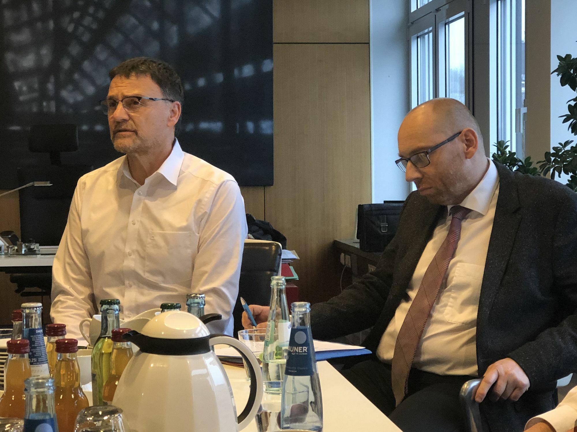 Landrat Heinz-Peter Thiel (l.) und Dr. Volker Schneiders (r.) informierten über die ersten beiden bestätigten Coronavirus-Infektionen. Foto: Woltmann