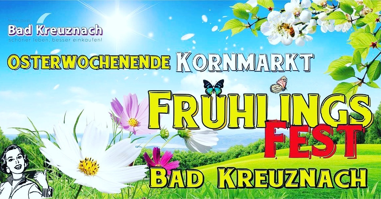 „Wir wollen die Innenstadt an diesen Tagen beleben und den Besucherinnen und Besucher ein attraktives Programm bieten“. Dabei denkt „Meine Stadt Bad Kreuznach“-Geschäftsführer Andreas Schnorrenberger insbesondere an Familien, denn neben Schlemmereien, Tombola- und Schießbuden locken natürlich Kinderkarussells. Unterstützt wird die Veranstaltung von der Wirtschaftsförderung der Stadt. „Wir fördern gerne jede nachhaltige Initiative, die eine lebendige Innenstadt zum Ziel hat. Das 1. Kornmarkt Frühlingsfest ist für Familien und für viele andere, die nicht in den Osterurlaub gefahren sind, ein Angebot, die Innenstadt zu besuchen, Schaufenster bummeln und sich auf dem Kornmarkt mit Freunden zu treffen“, so der zuständige Beigeordnete Udo Bausch. Öffnungszeiten: Ostersamstag 12.00 bis 22.30 Uhr Ostersonntag 12.00 bis 22.30 Uhr Ostermontag 12.00 bis 22.30 Uhr