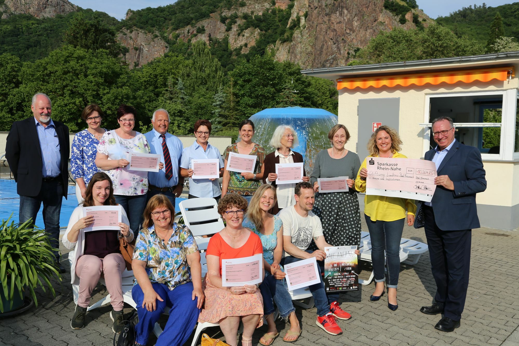 Landrätin Bettina Dickes, zugleicht Stiftungsvorsitzende, überreichte die Spenden vor kurzem im Freibad Bad Münster. 1 500 Euro gehen an die Initiative für Freizeit und Musikkultur für die Durchführung des Festivals »Auf Anfang!« (26. und 27. Juli in Auen). Die Kantorei an der Pauluskirche erhält 550 Euro für die Finanzierung der Orgelerlebnistage in Sargenroth. 1.564,85 Euro gehen an die DLRG Bad Münster für die Anschaffung einer neuen Laufmatte für das Freibad. Die Ortsgemeinde Feilbingert erhält 650 Euro für die Sanierung eines historischen Grabmals. 2.500 Euro gehen an den »Stromberger Tisch«, die AWO-Begegnunsstätte in Kirn erhält 1.500 Euro. Je 1 000 Euro gehen an die Alfred-Delp-Schule und die Konzertgesellschaft Bad Kreuznach. »All jene, die heute hier sind, um die Spenden entgegen zu nehmen, machen mehr für die Gesellschaft, als sie müssten«, freute sich die Landrätin.