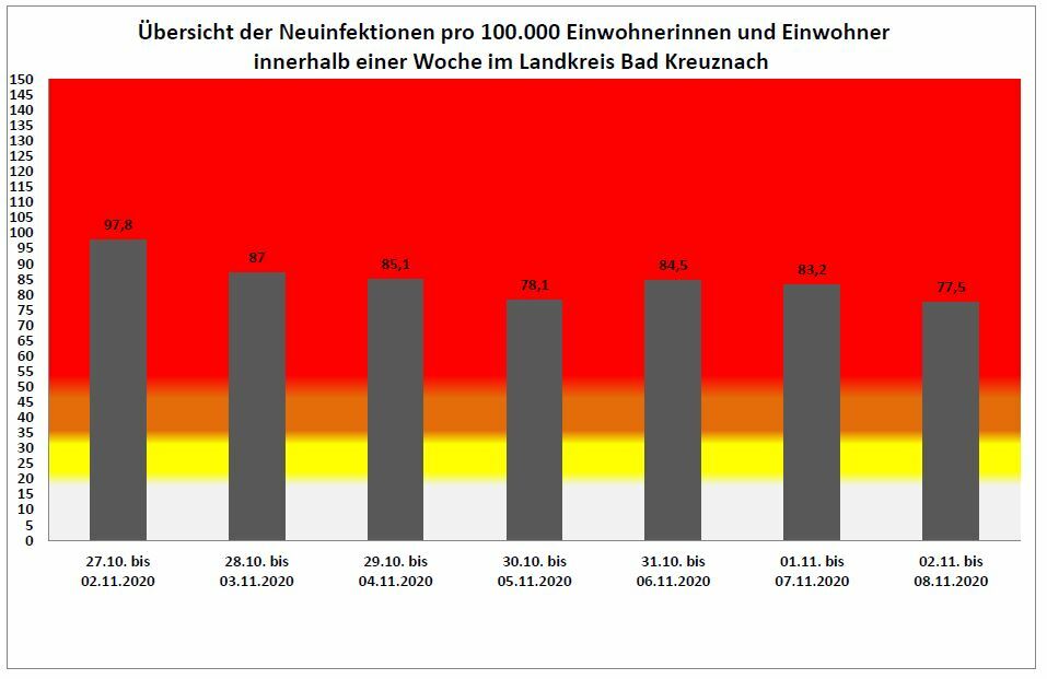 Die Zahl der seit Auftreten des ersten nachgewiesenen Falles mit dem Coronavirus infizierter Personen im Landkreis Bad Kreuznach ist seit dem letzten Update (07.11.2020, 11.00 Uhr) um 11 gestiegen. Aktuell stehen somit 290 nachgewiesen infizierte Personen aus dem Landkreis in der Betreuung des Gesundheitsamtes. Sechs dieser Personen befinden sich in stationärer Behandlung. Neufälle pro 100.000 Einwohner gab es innerhalb der vergangenen sieben Tage 77,5. Der Schwerpunjkt der Corona-Neuinfektionen liegt in der Stadt Bad Kreuznach. Die betroffene Gebietskörperschaften im Einzelnen: Stadt Bad Kreuznach (132), Verbandsgemeinde Rüdesheim (45), Verbandsgemeinde Nahe-Glan (27), Verbandsgemeinde Bad Kreuznach (23), Verbandsgemeinde Langenlonsheim-Stromberg (31), Verbandsgemeinde Kirner-Land (32).