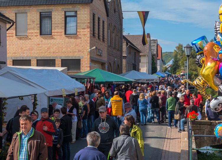 Geboten werden dann unter anderem eine große Traktorenausstellung inklusive der dazu passenden landwirtschaftlichen Arbeitsgeräte für die Bodenbearbeitung und Ernte. Die Marktstände bieten das Beste aus der Region an Obst und Gemüse. Würste und ausgefallene Spezialitäten in Dosen sind zu erwerben. Verschiedene Kartoffelsorten und leuchtende Herbstfrüchte wie Kürbisse werden angeboten. Heimische Produkte vom Wild wie Schinken und Würste sind im Angebot. Die mit vielen Auszeichnungen und Preisen prämierte Brennerei aus dem Ort stellt ihre große Auswahl an Edelbränden vor. Die Bäckerei des Dorfes biete ihre frischen Backwaren an und der Renner das Grumbierebrot. Handgearbeitete Kissen, Decken und Tischwäsche können erstanden werden. Dazu Schals, Mützen und Handschuhe und für die Füße selbst gestrickte warme Socken für den Winter. Eine große Auswahl an Bastelarbeiten aus verschiedenen Bereichen ist immer wieder ein Augenschmaus. Dazu gibt es Stände mit Kleidung und Haushaltswaren aller Art. Last not least die braune Knolle zum Einkellern direkt vom Erzeuger. Für Melodien und Lieder sorgt eine Musikkapelle aus der Verbandsgemeinde. Im Gemeindehaus von Schweinschied werden die verschiedensten Torten und Kuchen an einer langen Theke angeboten. Jede Landfrau bereitet ihr Gebäck nach eigenem Rezept zu und bei frisch gebrühtem Kaffee ist Entspannung angesagt. Die Männer und Stammtischbrüder (die Initiatoren des Marktes) zapfen ein zünftiges Bier und schenken ein gutes Glas Wein aus. Die Landfrauen legen sich für die Kartoffelgerichte wieder ins Zeug und sind bestens vorbereitet. Sehr beliebt sind immer wieder die Pfannkuchen und die Grumbieresupp. Auch den kleinen Gästen wird etwas geboten. Ponyreiten und Mitmachangebote lassen keine Langeweile aufkommen.