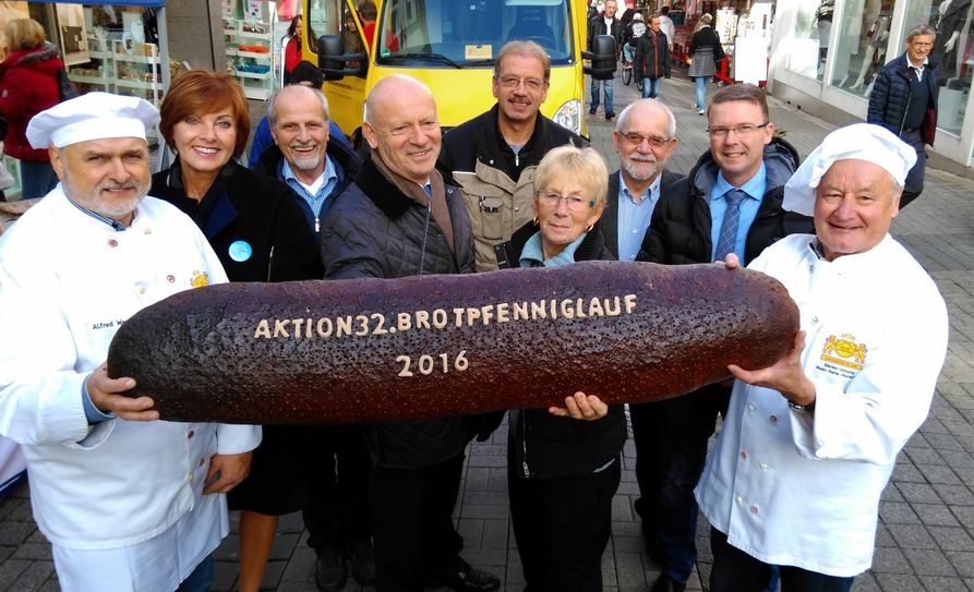 Mit beim Auftakt dabei waren unter anderem Vertreter der Spendenempfänger, VG-Bürgermeister Markus Lüttger, und als Repräsentant des Hauptsonsors Horst Weyand, Vorstandsvorsitzender der Voksbank Rhein-Nahe-Hunsrück. Dieser betonte: »Wir unterstützen die Benefizaktion der Bäcker sehr gerne, denn sie kommt den Menschen in unsrer Region zu Gute.« Der Erlös der aktuellen Aktion der Bäcker ist für den Kinderschutzbund und den Weissen Ring Bad Kreuznach sowie für Opfer des jüngsten Hochwassers in Stromberg bestimmt. Höhepunkt ist der Brotpfenniglauf von Kirn über Bad Sobernheim nach Bad Kreuznach am Samstag, 26. November, ab 12 Uhr. Auch an den Stationen des Laufes in Kirn, Bad Sobernheim und Bad Kreuznach wird die Bäcker-Innung an Ständen Backwaren wie Berliner und Weihnachtsmänner, Glühwein, Kaffee und andere Genüsse für die gute Sache verkaufen. Mit einem Einkauf unterstützt jeder die Benefizaktion.
