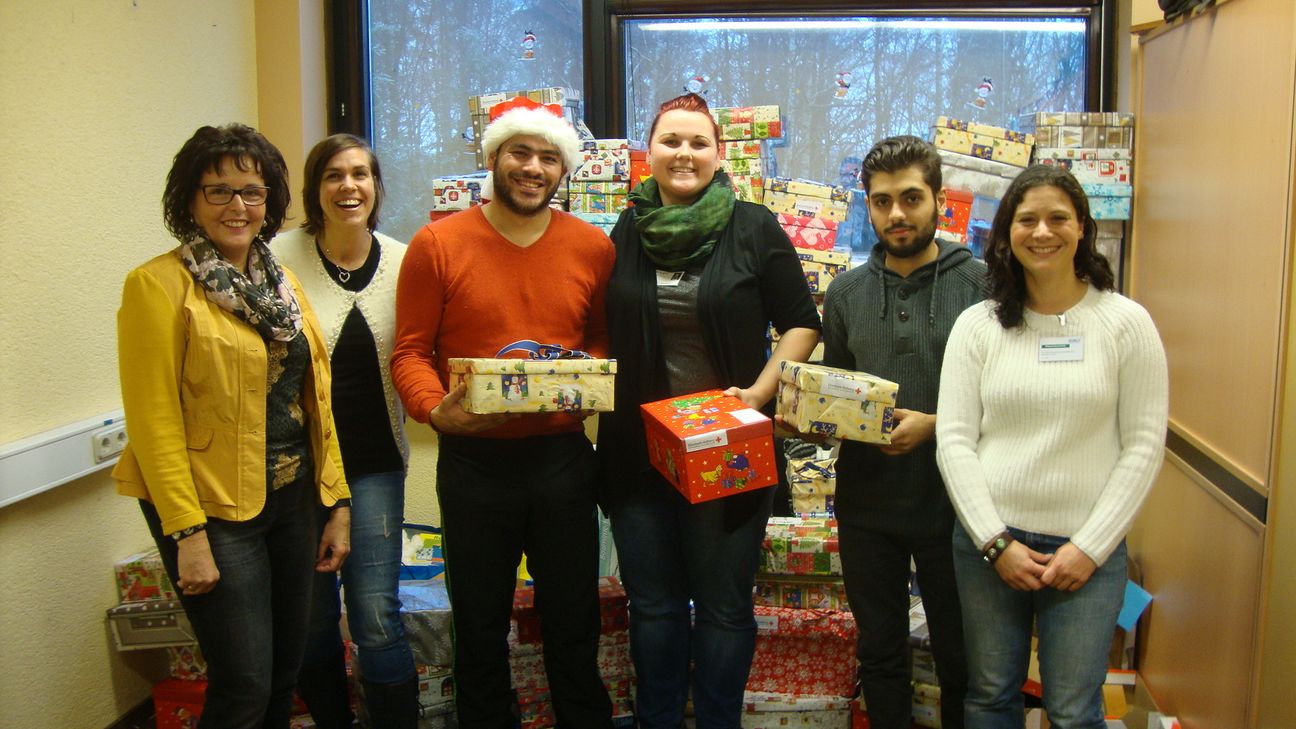 Schon seit Wochen werden Stifte, Malbücher, Spielzeugautos, Hygieneartikel, Schals, Puzzlespiele und Puppen gesammelt. In mit Geschenkpapier beklebten Schuhkartons wurden nun die gebrauchten oder neuen Sachen sortiert, diese mit Aufklebern mit Alter und Geschlecht versehen und hübsch dekoriert. Stofftiere dürfen aus hygienischen Gründen leider nicht angenommen werden, erklärt Katharina Thomé (3.v.r), Mitarbeiterin der AfA in Birkenfeld.