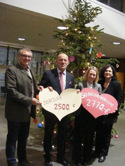 Einen Monat lang zierte ein virtueller Wunschbaum die Internetseite der Volksbank Rhein-Nahe-Hunsrück. Zu Weihnachten konnten Nutzer notleidenden Familien ein Geschenk machen. Die Bitte kam an: Hilfsbereite Spender erfüllten alle 50 Herzenswünsche von Menschen in den Landkreisen Bad Kreuznach und Rhein-Hunsrück. Die Volksbank-Vorstände Horst Weyand und Odo Steinmann übergaben nun die für die Geschenke bestimmten Geldspenden - insgesamt 2 770 Euro - an den Bad Kreuznacher Caritas-Dienststellenleiter Markus Weber und seine für Simmern und Boppard zuständige Kollegin Ilona Besha. Die Volksbank selbst legte noch einem 2 500 Euro für weitere Hilfsangebote der Caritas obendrauf. »Als Spender weiß ich, dass ich hier vor Ort helfe – vielleicht geht mein Geld sogar in die Nachbarschaft, an jemanden, dem ich gerne persönlich Hilfe anbieten würde«, so Volksbank-Vorstand Weyands Fazit zur gelungenen Wunschbaum-Aktion. Der ausdrückliche Dank von Ilona Besha und Markus Weber gilt allen, die den digitalen Wunschbaum unterstützt haben. Dass dieser nun schon zum vierten Mal so erfolgreich war, ist für beide »ein Zeichen von gesellschaftlicher Solidarität.« Weitere Informationen gibt es über Telefon 0 67 61 / 91 96 90 oder unter: www.caritas-rhn.de
