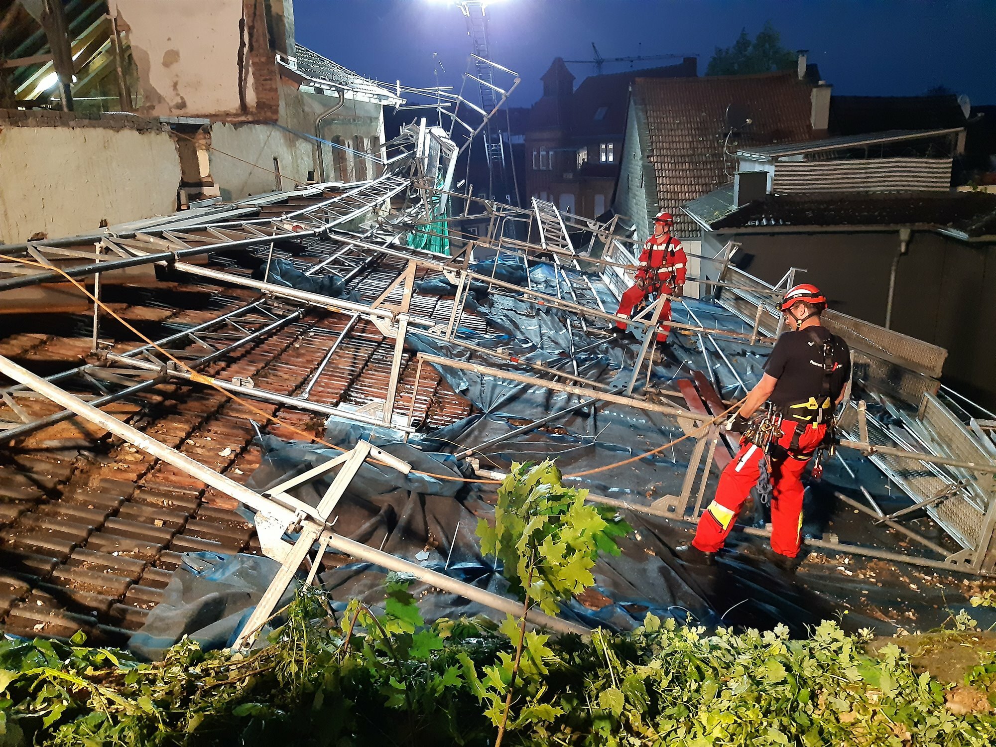Feuerwehrleute aus den Löschbezirken Nord, Süd und Ost und aus Rüdesheim sicherten die Reste des verbogenen und schief stehenden Gerüsts. Stück für Stück trugen die an Leinen gesicherten Höhenretter die einzelnen Gerüstteile ab. Das noch stehende Gerüst wurde mit einem Mehrzweckzug zunächst gesichert, dann wieder zur Hauswand gezogen und dort befestigt. Mit einem zweiten Mehrzweckzug wurde das über die Dachkante hängende Gerüst nach und nach zurückgezogen.