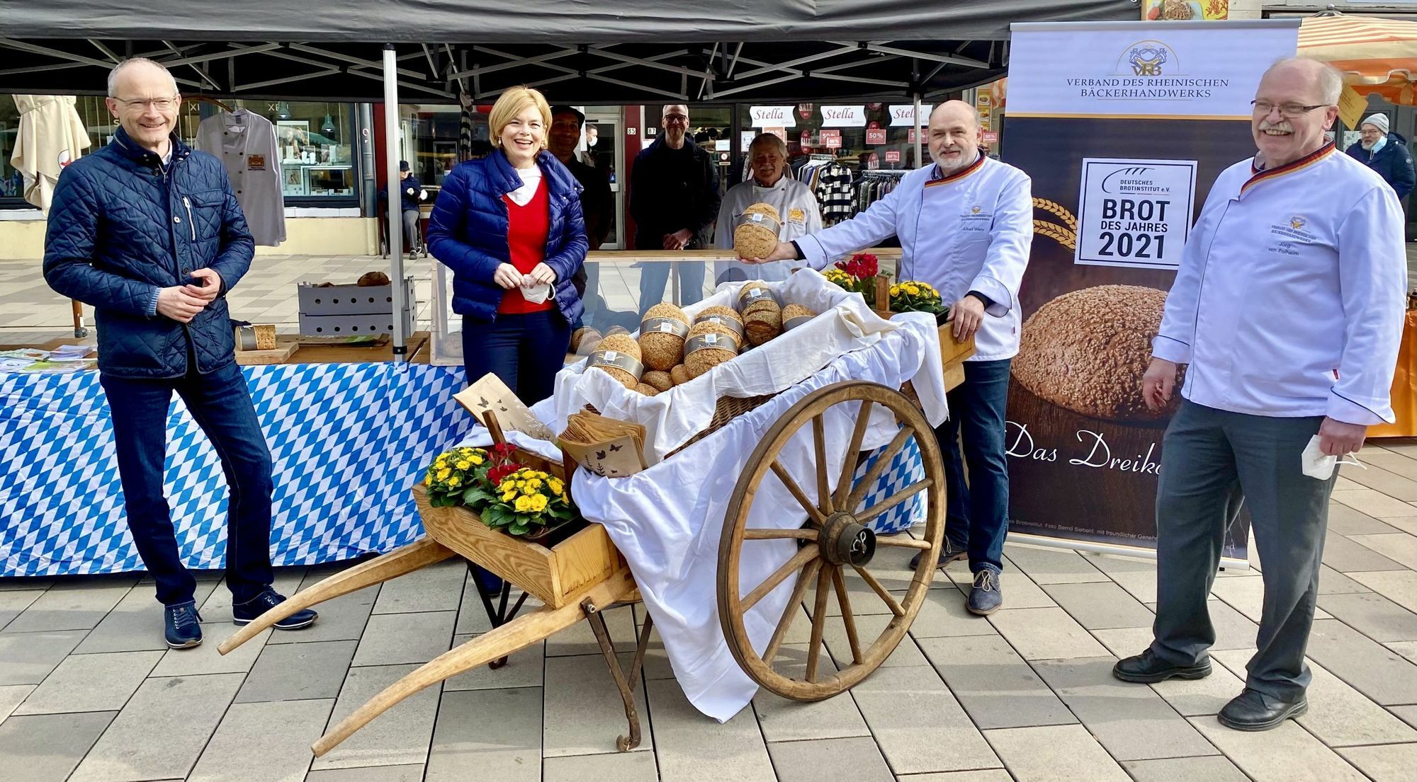 Bundesernährungsministerin Julia Klöckner schaute in der vergangenen Woche auf dem Bad Kreuznacher Wochenmarkt vorbei, um gemeinsam mit Bäcker-Obermeister Alfred Wenz das "Brot des Jahres 2021" zu verkosten - ein nussig-aromatisches Dreikornbrot, das vom Deutschen Brotinstitut entwickelt wurde.