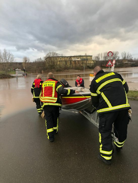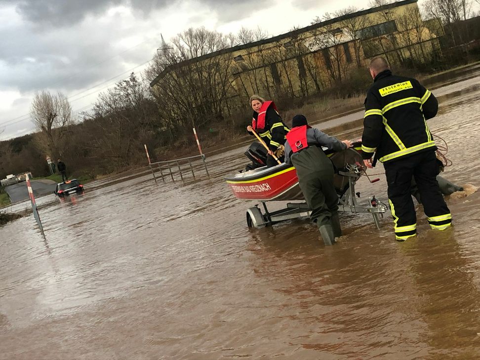 Zu diesem Zeitpunkt war der Pegelstand an der Nahe bereits wieder gesunken. Heute morgen um 8 Uhr stand die Nahe bei 5,08 Metern. Bis heute Abend soll der Pegelstand auf 4,40 Meter fallen. Ab Dienstagnacht, 0 Uhr, war Feuerwehreinsatzzentrale dauerhaft besetzt. Die Pegelstände und neuralgische Punkte im Stadtgebiet wurden stetig durch ein Fahrzeug kontrolliert. Der Bauhof füllte 1 000 Sandsäcke und sperrte die Zufahrten zum Kompostwerk, zum Klärwerk, den Fußweg zur Pfingstwiese unter der Landfuhrbrücke und den Fußweg unter der Friedensbrücke in Bad Münster. Verschiedene Ämter der Stadt und Anrainer wie etwa die Fritz-Schirmbar, das Brauwerk, und der Campingplatz Saline Karlshalle wurden informiert, damit sie selbständig Vorsorge treffen und die Außenbereiche räumen konnten. Die Oberbürgermeisterin wurde ständig telefonisch auf den aktuellen Stand gebracht. Gegen 10 Uhr wurden neun Kräfte des Löschbezirks West alarmiert, um innerhalb von etwa 90 Minuten Fahrzeuge am Kapitän-Lorenz-Ufer zu räumen. Die Straße wurde gesperrt. Zwischen 12 Uhr und 17 Uhr übernahmen die Feuerwehrleute des Hauptamtes die Pegelkontrollen, damit sich die in der Nacht eingesetzten Kräfte des Führungsdienstes ausruhen konnten. In der Spitze wurde ein Nahepegel von 5,90 Metern und ein Ellerbachpegel von 1,90 Metern abgelesen. Sperrung missachtet: Rettungseinsatz ausgelöst Gegen 9.30 Uhr wurde die Fahrzeugbesatzung, die den Pegel in Bad Münster ablesen wollte, auf zwei um Hilfe rufende Personen hinter dem Hähnchengrill am Ortseingang aufmerksam. Sie missachteten die Absperrung und gerieten ins Wasser. Die Kameraden halfen den Beiden ans Ufer. Gegen 16.00 Uhr missachtete ein Pkw-Fahrer die Sperrung der Zufahrt zum Kompostwerk und fuhr sich im Wasser fest. Er saß plötzlich hüfthoch im Wasser, kletterte auf sein Fahrzeugdach und machte auf sich aufmerksam. Ein Rettungsboot wurde auf dem Trailer verbleibend neben den PKW gefahren, damit der Fahrer einsteigen und aufs Trockene gefahren werden konnte. Ein Rüstwagen (Unimog) der Freiwilligen Feuerwehr Langenlonsheim fuhr zu dem PKW. Kameraden in Wathosen schlugen die Seilwinde an. Unter herauslaufender Seilwinde fuhr der Rüstwagen zurück und zog den PKW dann aus dem Wasser. Insgesamt waren die Löschbezirke Süd und West sowie die Kameraden aus Langenlonsheim mit acht Fahrzeugen und 27 Kräften 90 Minuten lang im Einsatz.