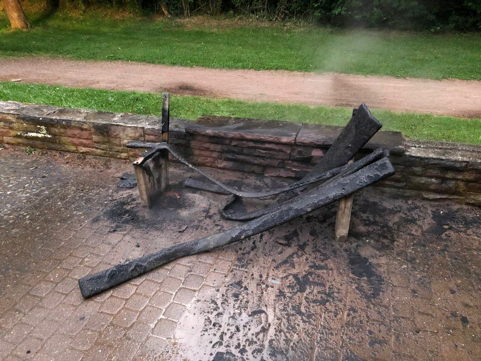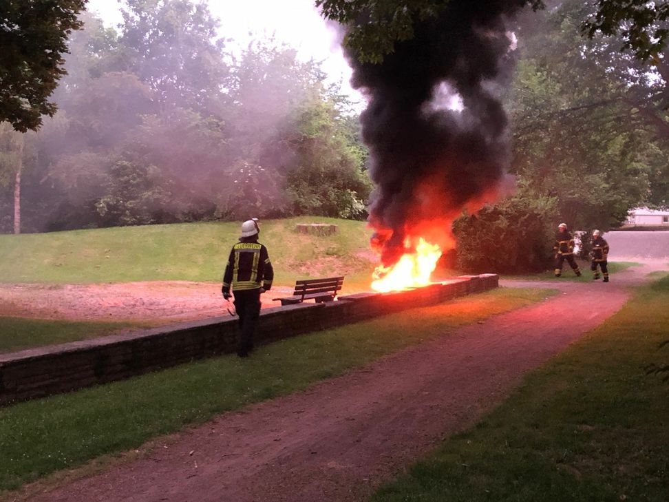 Die Kunststoff-Bank brannte lichterloh und verursachte eine starke Rauchentwicklung. Die angerückte Feuerwehr konnte den Brand nach kurzer Zeit löschen.