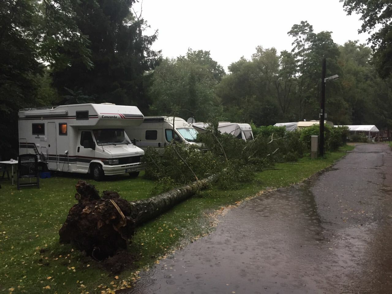 Das war knapp: Ein Unwetter entwurzelte am vergangenen Freitagabend einen Baum auf dem Gelände des Campingplatz Nahe-Alsenz-Eck in Bad Münster am Stein. Glücklicherweise verfehlte der umstürzende Baum die in der Nähe abgestellten Campingwagen.