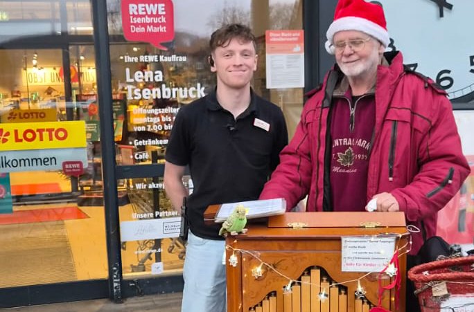 Denn die Einnahmen sind jeweils für den guten Zweck bestimmt, um Kindern in Not zu helfen. Die Auswahl fällt nicht schwer, denn die Spenden kommen der Soonwaldstiftung zu Gute. Auch in diesem Jahr hatte Fewinger wieder verschiedene Standorte, wie z.B. die Rewe-Märkte in Kirn und Bad Sobernheim oder auch beim Hevert-Weihnachtsmarkt in Nußbaum. Sogar bei der 1225-Jahr-Feier in Großenenglis spielte er. Oft wird er auch von seiner Kollegin, Drehorgelspielerin Erika Brandt, begleitet, und die beiden trotzen jeder Witterung. Selbst bei starkem Regen lassen sich die beiden nicht davon abhalten, etwas Weihnachtsstimmung in den hektischen Alltag zu bringen. Kurz vor Weihnachten überbrachte Fewinger dann die gesamten Einnahmen in Höhe von 655,92 € in Form einer Spende an Herbert Wirzius, den ehrenamtlichen Vorsitzenden der Stiftung, der sich über dessen sowie Erika Brandts Einsatz sehr freut und das Engagement der beiden lobte.