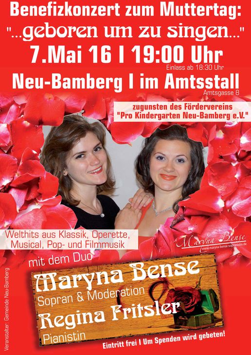 Zum Muttertag findet am Samstag, 7. Mai, um 19 Uhr in Neu-Bamberg ein Benfizkonzert mit der Sopranistin Maryna Bense und der Pianistin Regina Fritsler statt.
