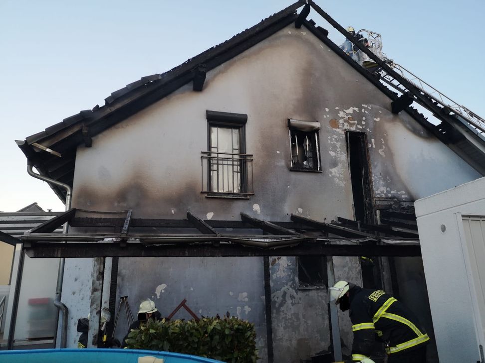 Die Flammen griffen von dort aus schnell auf ein Holzcarport und das Wohnhaus über. Auch die Garage eines Nachbarn wurde beschädigt. Schließlich breitete sich das Feuer bis auf das Dachgeschoss des Wohnhauses aus. Die Feuerwehr konnte den Brand löschen, alle Hausbewohner konnten das Haus unverletzt verlassen. Das Wohnhaus wurde durch das Feuer so stark beschädigt, dass es nicht mehr bewohnt werden kann. Der Schaden wird auf einen niedrigen sechsstelligen Betrag geschätzt. Die Kriminalpolizei hat die Ermittlungen übernommen.