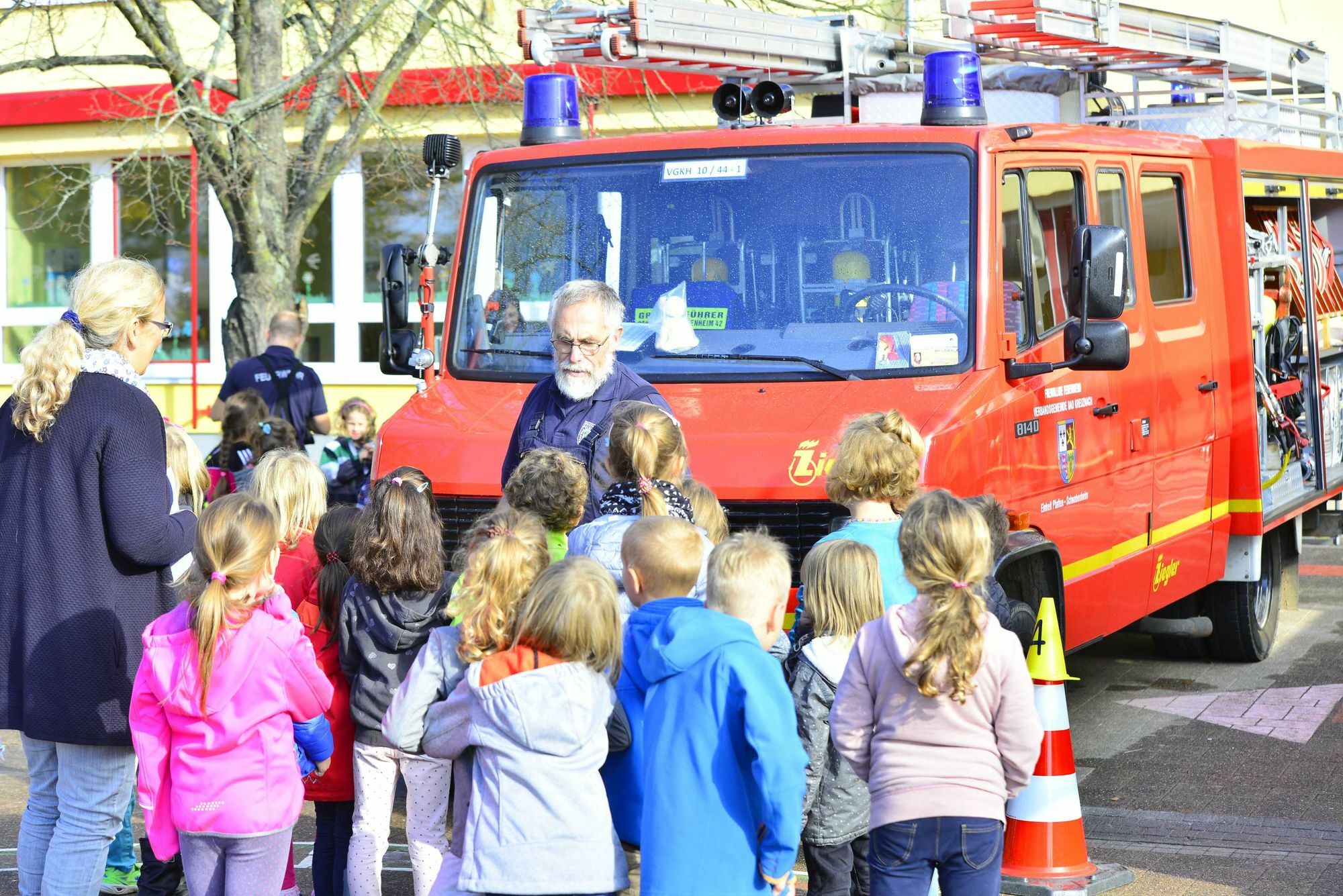 Marco, Philipp und Lucie sind seit Kindergartentagen beste Freunde. Gemeinsam gehen sie durch dick und dünn, meistern Gefahren und bestehen viele Abenteuer. So auch im Stück „Marco und das Feuer“, bei dem brennende Kerzen, vergessene Herdplatten und gezündete Streichhölzer für Action und viel Spannung sorgen. Wie auf alle Kinder hat Feuer auch auf die Drei eine magische Anziehungskraft. Doch schnell kann aus Spaß Ernst werden, was sie am eigenen Leib erfahren müssen. Gemeinsam bewältigen die Freunde gefährliche Situationen, doch als Marco und Philipp sich hinter Lucies Rücken zu einem nächtlichen Lagerfeuer verabreden, steht mehr als ihre Freundschaft auf dem Spiel. Das Feuer breitet sich rasend aus – durch ein variables Bühnenbild dargestellten Wald in Flammen. Mehr Lebensretter warteten im Anschluss auf die Kinder im Schulhof, nach dem Theaterstück. Hier waren verschiedenen Stationen für die Schulklassen aufgebaut. Darunter Fahrzeugbesichtigungen wie etwa der Rüstwagen der Feuerwehr Neu-Bamberg, die 30 Meter hohe Drehleiter der Feuerwehr Bad Kreuznach, der VG Einsatzleitwagen und zwei Fahrzeuge der Feuerwehr Pfaffen-Schwabenheim. Die Firma TC-Brandschutztechnik aus Bad Kreuznach zeigte den Kindern den Umgang mit Feuerlöschern an einem Brandsimulator. Der ASB Rettungsdienst war mit einem Rettungswagen vor Ort, dieser konnte von den Kindern ebenfalls besichtigt werden. Die Bambini-Feuerwehr der VG Bad Kreuznach informierten die Kinder und warben um den Nachwuchs.