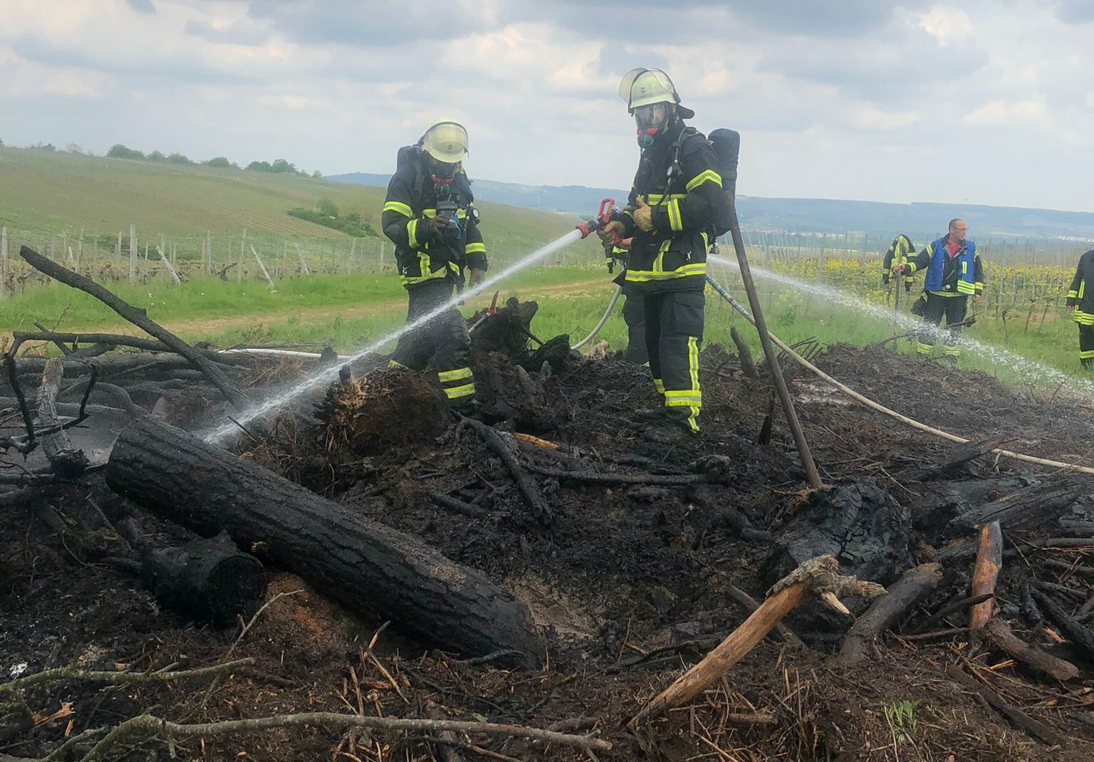 Kurz vor drei Uhr nachmittags hatten Jugendliche das ungeplante Maifeuer auf dem Feld bei Winzenheim in Richtung Bretzenheim gemeldet. Holzreste schwelten dort unter starker Rauchentwicklung vor sich hin. Bereits nachts zuvor brannte ein Haufen von Holzstämmen und Baumwurzeln auf einem Feld in voller Ausdehnung. Hier waren Kräfte des Löschbezirks Nord und der Freiwilligen Feuerwehren Bretzenheim und Langenlonsheim im Einsatz, um die Flammen zu löschen.