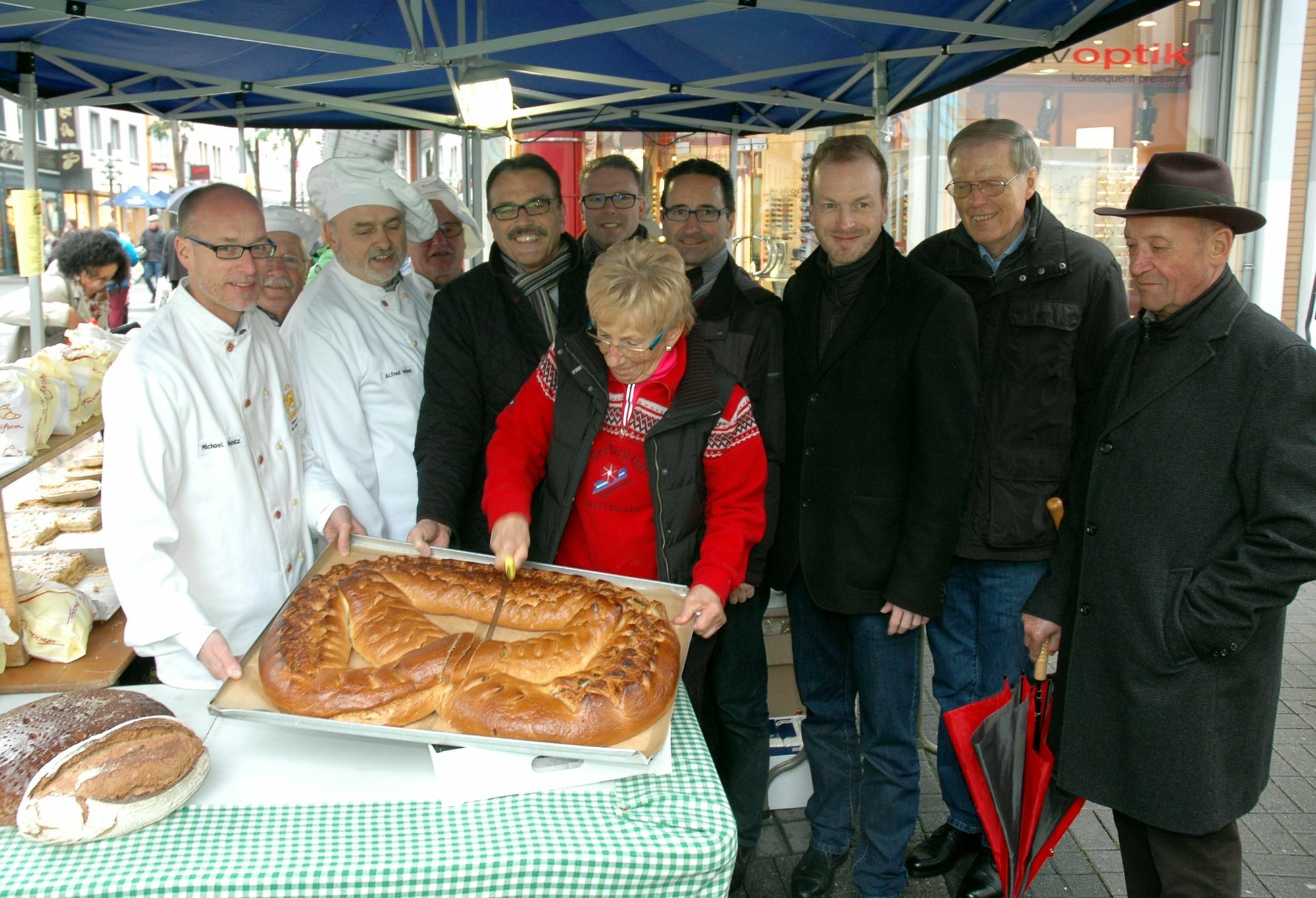 Mit dem Anschnitt einer großen Bretzel in XXL-Größe eröffneten die Bäcker der Innung rund um Obermeister Alfred Wenz jüngst unter anderem gemeinsam mit Landrat Franz-Josef Diel, Verbandsgemeinde-Bürgermeister Markus Lüttger und Vertretern der Spendenempfänger die Brotpfennig-Aktion, deren Erlös einem guten Zweck zugute kommt. Höhepunkt ist der Brotpfenniglauf von Kirn über Bad Sobernheim nach Bad Kreuznach am Samstag, 28. November, ab 12 Uhr. Der Erlös der Aktion ist in diesem Jahr für die Ökumenische Sozialstation Nahe sowie das Eugenie Michels Hospiz Bad Kreuznach und das stationäre Hospiz Simmern (beides Einrichtungen der „Stiftung Kreuznacher Diakonie“ bestimmt.