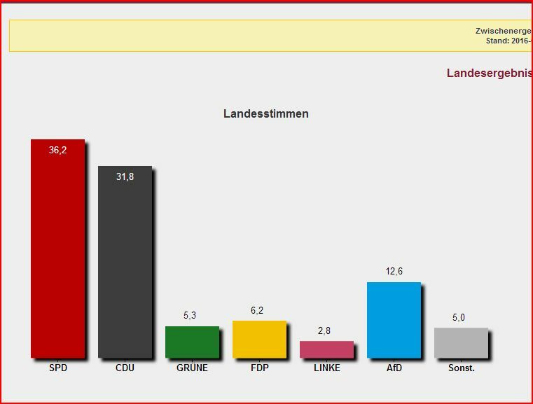 Nach dem aktuellen Stand der Auszählung der Landtagswahl in Rheinland-Pfalz (21.30 Uhr) ist die SPD deutlich vor der CDU die stärkste Kraft im Land geworden. Die SPD hat 36,2 Prozent der Stimmen erhalten, die CDU landet mit 31,8 Prozent der Stimmen auf Rang zwei.