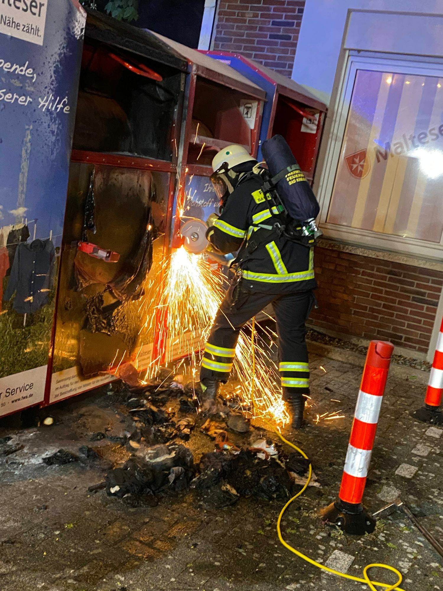 Die öffneten das Schloss des Altkleidercontainers mit einem Trennschleifer, räumten die wenigen darin befindlichen brennenden Kleidungsstücke heraus und löschten sie ab. Auch Flammen unter den insgesamt vier aufgestellten Containern wurden von dem Trupp unter Atemschutz gelöscht. Da der direkt daneben stehende Altkleidercontainer ebenfalls stark rauchte, wurde auch dieser mit dem Trennschleifer geöffnet.