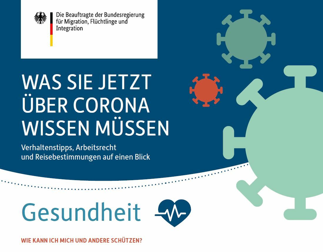 Unter dem Titel „Was wir jetzt über Corona wissen müssen“ informiert der Flyer über die Auswirkungen der Corona-Pandemie auf die Bereiche Gesundheit, Öffentliches Leben, Arbeiten und Geld, Einreisen und Ausreisen. Zudem beinhaltet der Flyer weiterführende Links zu Informations-Webseiten. Der Informationsflyer liegt in Deutsch sowie in 18 weiteren Sprachen vor, und zwar in Englisch, Französisch, Türkisch, Italienisch, Russisch, Farsi, Chinesisch, Arabisch, Spanisch, Bulgarisch, Polnisch, Rumänisch, Ungarisch, Griechisch, Vietnamesisch, Dari, Tigrinja und Albanisch.