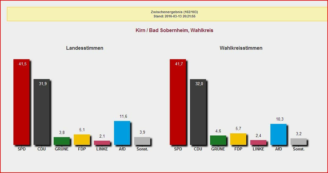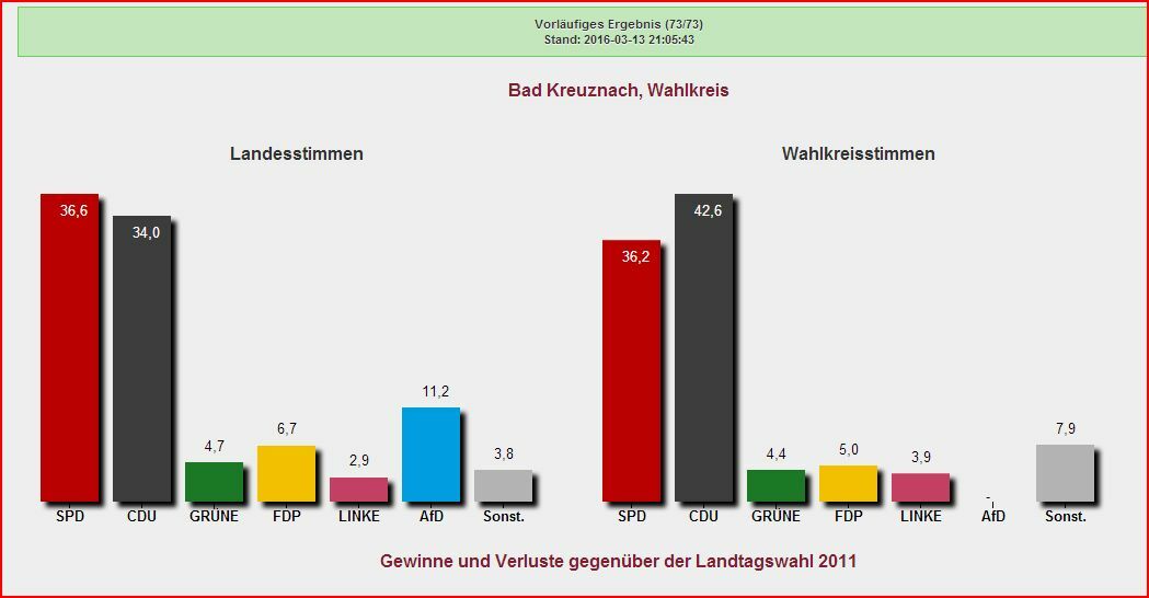 Ein Wahlkreis geht bei der Landtagswahl an der SPD, einer an der CDU: Im Wahlkreis 17 (Bad Kreuznach) hat Julia Klöckner (CDU) die meisten Stimmen errungen, im Wahlkreis 18 (Kirn / Bad Sobernheim) SPD-Mann Denis Alt (Stand 21 Uhr).