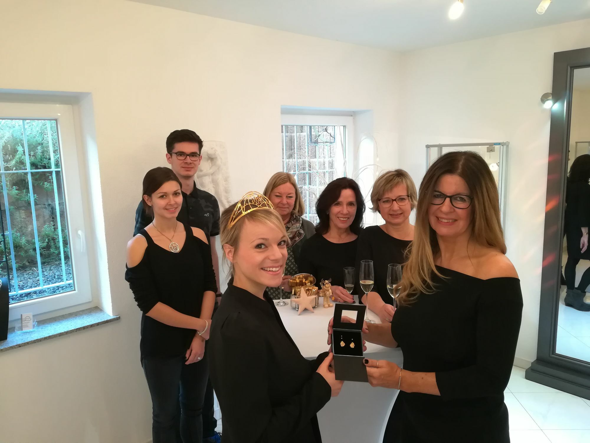 Die Deutsche Weinkönigin Katharina Staab hat klare Vorstellungen, wenn es um den Schmuck passend zur Krone geht. Am besten schlicht und edel soll er sein. So überreichte Nina Lohmann, Goldschmiedin aus Rüdesheim/ Nahe, die bereits der Deutschen Weinkönigin Nadine Poss ein Kollier gestaltete, insgesamt fünf Ohrringe, die aus Gelb- und Rotgold gefertigt wurden. Dreizehn Beeren, die kunstvoll eingearbeitet wurden, spiegeln alle Deutschen Weinanbaugebiete wider. Katharina Staab freute sich sehr über dieses wertvolle Geschenk, dass Frau Lohmann exklusiv für sie kreiert hat und bedankte sich herzlich. Bisher hatte sie wenig Goldschmuck und nun könne sie die Ohrringe, die ausgezeichnet zur Krone passen, bei ihren zahlreichen Auftritten im In-und Ausland tragen. Als nächstes geht es für sie auf ihrer Tour durch die Deutschen Weinanbaugebiete an die Mosel und im Januar dann weiter nach Berlin und in die Schweiz.