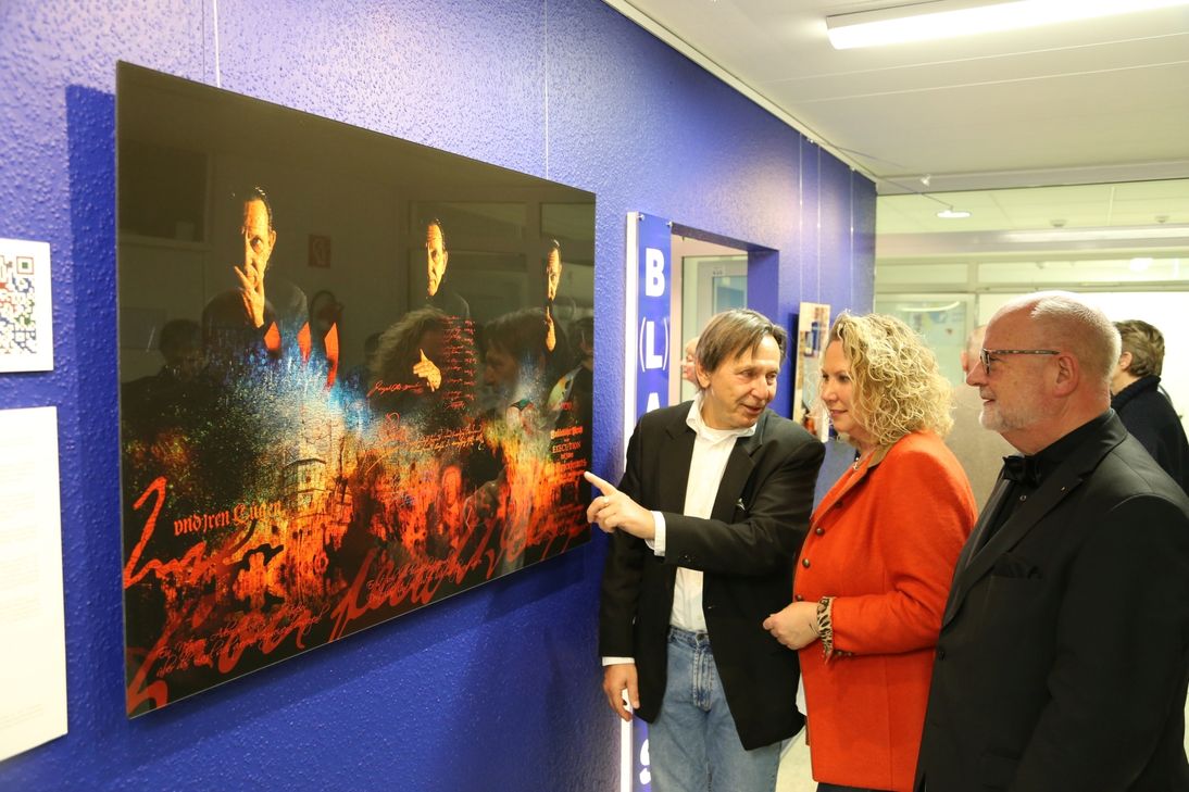 „Die B(l)aupause ist längst zur echten Institution in der Kreisverwaltung geworden“, freute sich Landrätin Bettina Dickes. Mit René Blättermann sei ein wunderbarer Künstler dafür gewonnen worden, die aktuelle Ausstellung zu gestalten. Zugleich dankte die Landrätin dem Kreisbaudirektor für dessen Herzblut, welches er seit 2016 in die Kunstausstellungsreihe steckte. „Sie haben die B(l)aupause ins Leben gerufen und konnten in den vergangenen zwei Jahren zehn großartige Künstlerinnen und Künstler dafür gewinnen, im Flur des Bauamts ihre Kunst zu präsentieren“, so die Landrätin. Diese Ausgabe der B(l)aupause wird die letzte unter Kreisbaudirektor Bergs sein, der Ende 2018 in seinen verdienten Ruhestand wechselt. „Die Institution B(l)aupause wird aber dennoch weiter gehen“, verspricht Dickes. Zwei weitere Ausstellungen seien bereits vorbereitet, ergänzte Bergs zufrieden. „Ich freue mich sehr, dass diese Ausstellung nun von René Blättermann gestaltet wird“, so der scheidende Bauamtsleiter. Mit dem Künstler sei er am Rande der Gestaltung des Synagogenfensters vor etwa einem Jahr in Kontakt gekommen. „René Blättermann ging auf meinen Vorschlag ein, in der Kreisverwaltung auszustellen, worüber ich sehr dankbar bin“, bemerkte Bergs. Er erinnerte, dass die Intention der B(l)aupause darin liege, Menschen, die die Ausstellung passieren, an die Kunst heranzuführen. „Die hier ausgestellte Kunst soll dazu anregen, sich Gedanken zu machen“. Auch der Künstler selbst, der sichtbar viel Energie in die Kunstwerke und seine Ausstellung in der Kreisverwaltung legte, zeigte sich zufrieden. In seiner Serie zum Fall Oppenheimer arbeitet Blättermann die Geschichte des Joseph Süß Oppenheimer künstlerisch auf. „Ich befasse mich mit dem Fall seit etwa 15 Jahren. Das Buch „Jud Süß“ hat mich so bewegt, dass ich nach dem Lesen in die Recherche zur Geschichte Oppenheimers einstieg“. Blättermann durchforstete alte Dokumente bis hin zu Gerichtsakten und zog Schlüsse aus den Recherchen, die er in die ausgestellte Kunst zu packen wusste. Der Leben Oppenheimers endete vor genau 280 Jahren in einem Schauprozess mit folgender Hinrichtung. Das Herzstück der Ausstellung stellt ein großes Triptychon dar, welches die drei Lebensphasen des Joseph Süß Oppenheimer künstlerisch wiedergibt. Aus verschiedenen Elementen vereint dominiert diese Darstellung die Ausstellung und zeigt viele Facetten des Vermächtnisses Oppenheimers. Neben den ausgestellten Kunstwerken haben die Ausstellungsbesucher auch die Gelegenheit, mobil verschiedene Sequenzen über angebrachte QR-Codes abzurufen. Zu sehen ist die aktuelle "B(l)aupause" noch bis zum 14. Januar im dritten Stock der Kreisverwaltung.