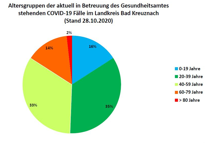 Die Zahl der mit dem Coronavirus infizierter Personen im Landkreis Bad Kreuznach ist seit dem letzten Update (gestern um 12 Uhr) um 16 Personen gestiegen. Die Warnstufe ist weiterhin rot. Prozentual gesehen kommen die meisten Corona-Fälle aktuell aus der Altersgruppe 20 bis 39 Jahre.