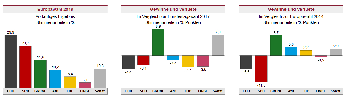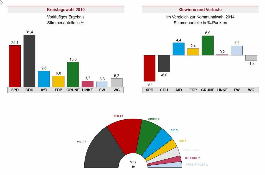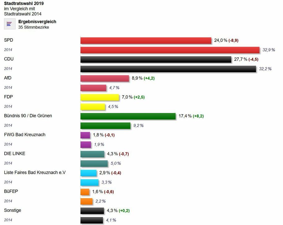 In Hargesheim treten Haiko Grün (BfH) und Werner Schwan (CDU) an, in Pleitersheim gehen Bodo Ehrhardt und Rudolf Eugen Graffe (BL Pleitersheim) in die Stichwahl. In Volxheim fällt die Entscheidung zwischen Christian Metzroth (SPD) und Axel Walter (BL Volxheim) und auch in Schweppenhausen ist die Entscheidung zwischen Günter Landwermann und Carsten Schmitt vertagt. Kontinuität in den Kreuznacher Stadtteilen In den Bad Kreuznacher Stadtteilen setzten die Wähler auf Kontinuität: Alle Ortsvorsteher - Mirko Helmut Kohl (Winzenheim, 79,7 Prozent), Dirk Gaul-Roßkopf (Planig 68,9 Prozent), Bernd Burghardt (Ippesheim, 80,5 Prozent), Volker Hertel (Bosenheim, 75,1 Prozent) und Bettina Mackeprang (BME, 68,7 Prozent) - wurden im Amt bestätigt. Mehr Bewegung gab‘s in den Verbandsgemeinden Rüdesheim, Bad Kreuznach und Langenlonsheim: Dort sind 14 Ortsbürgermeister neu im Amt: Petra Ender (Argenschwang), Sascha Wickert (Boos), Karlheinz Gellweiler (Braunweiler), Jörg Schneiß (Duchroth), Bernd Closen (Spall), Bernhard Haas (Sponheim), Heiko Schmitt (Weinsheim), Gabriele Schwarz-Müller (Biebelsheim), Gustav Kühnle (Frei-Laubersheim), Johann Klein (Hallgarten), Markus Müller (Neu-Bamberg), Olaf Budde (Bretzenheim), Barbara Sand (Laubenheim), Hartmut Merkelbach (Rümmelsheim) und Volker Stern (Windesheim). Kreis bei der Europawahl im Bundestrend Bei den Ergebnissen der Europawahl liegt der Kreis im Bundestrend: CDU (29,9 Prozent / -5,5) und SPD (23,7 / -11,5) verlieren deutlich, Grüne (15,8 / +8,7), AfD (10,2 / +3,6) und FDP (6,4 / +2,2) legen zu. Auch im Kreuznacher Stadtrat verliert die SPD (24 Prozent / -8,9) und liegt hinter CDU (27,7 / -4,5) und vor Grünen (17,4 / +8,2), AfD (8,9 / +4,2), FDP (7 / +2,5) und Linke (4,3 / -0,7) nur noch auf Platz zwei. Alle Wahlergebnisse im Detail finden Sie unter: www.wahlen.rlp.de und http://5273478.de.strato-hosting.eu/pcwahl/