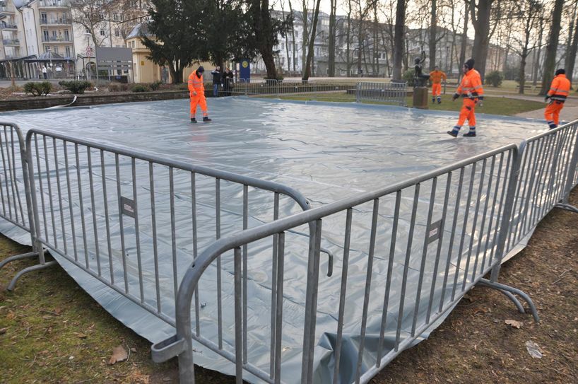 Am Musikpavillon grenzten Arbeiter des Bauhofes mit Kanthölzern eine 16x18 Meter große Fläche ein und belegte diese mit Folie. Dann ließen sie 25 Kubikmeter Wasser darauf laufen. Bis das Wasser zu einer etwa acht Zentimeter dicken Eisdecke gefroren ist, wird es mindestens 24 Stunden dauern. Am heutigen Dienstagnachmittag oder spätestens Mittwoch müsste die Eisbahn fertiggestellt sein. Dann heißt es: Rein ins Wintervergnügen! Denn mindestens bis zum Wochenende meldet der Wetterdienst weiterhin frostige Minusgrade.