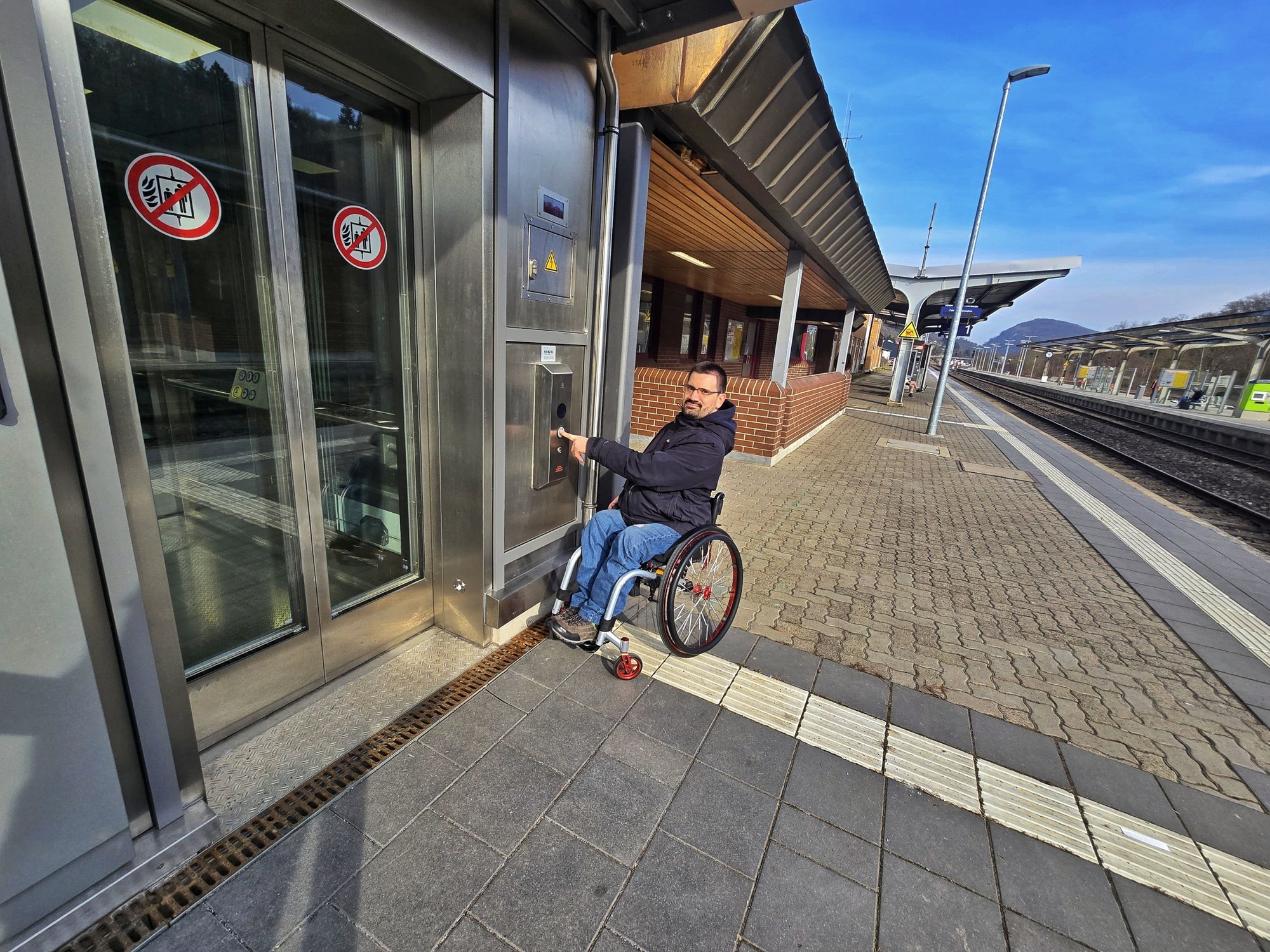 Zur Erinnerung, im Bahnhof hängen noch Schilder mit dem Slogan: "Barrierefreie Erschließung Bahnhof Kirn; die Bauarbeiten beginnen am 16. August 2021 und enden im Juni 2022!". Andre Stilz in seiner Funktion als Behinderten-Vertreter der VG Kirner Land freute sich, dass alle Menschen mit Einschränkung oder schwerem Gepäck nun problemlos die Züge erreichen. "Ich musste selbst einige Male von meinem Vater nach Bad Sobernheim oder Idar-Oberstein gefahren werden, um die Züge nach Mainz zu erreichen". Leider gab es am Premieretag am Kirner Bahnhof noch technische Probleme, die Aufzüge fuhren zwar hoch und runter, aber ohne Passanten, da die Türen sich nicht öffneten. Die Bereitschaftsmonteure mussten also gleich am ersten Tag nach dem Rechten schauen...