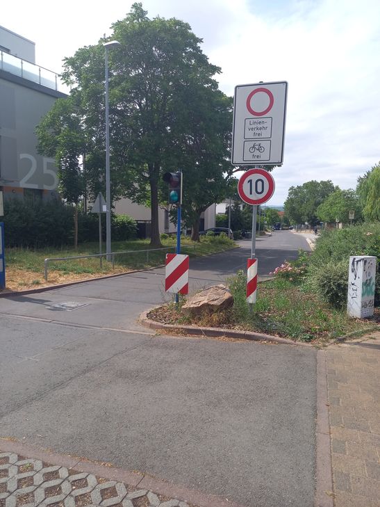 Dabei steht es deutlich auf den Verkehrszeichen: Durchfahrtverbot!,mit Ausnahme von Buslinien, Anlieger und Radfahrer.Die maximale Geschwindigkeit beträgt 10 km/h.Es wird täglich von hunderten Autofahrern ignoriert. Stattdessen, weil die Durchfahrt verboten ist,versuchen die Autofahrer es, mit besonderes schnellen Geschwindigkeit den Abschnitt zu passieren.