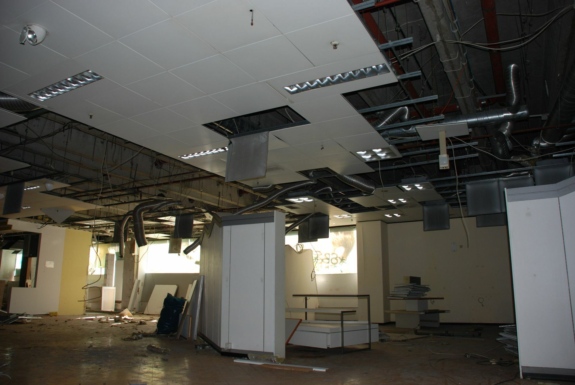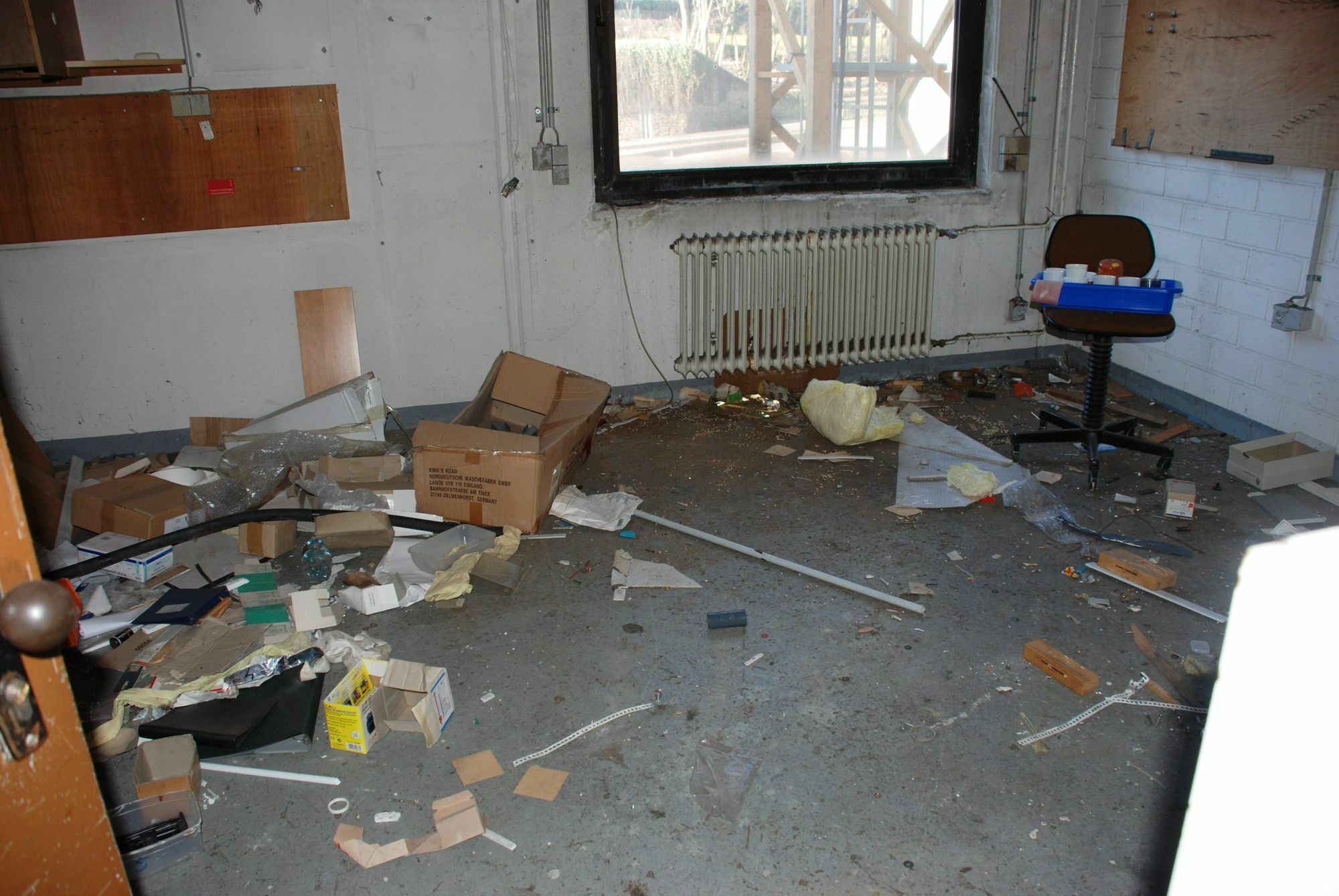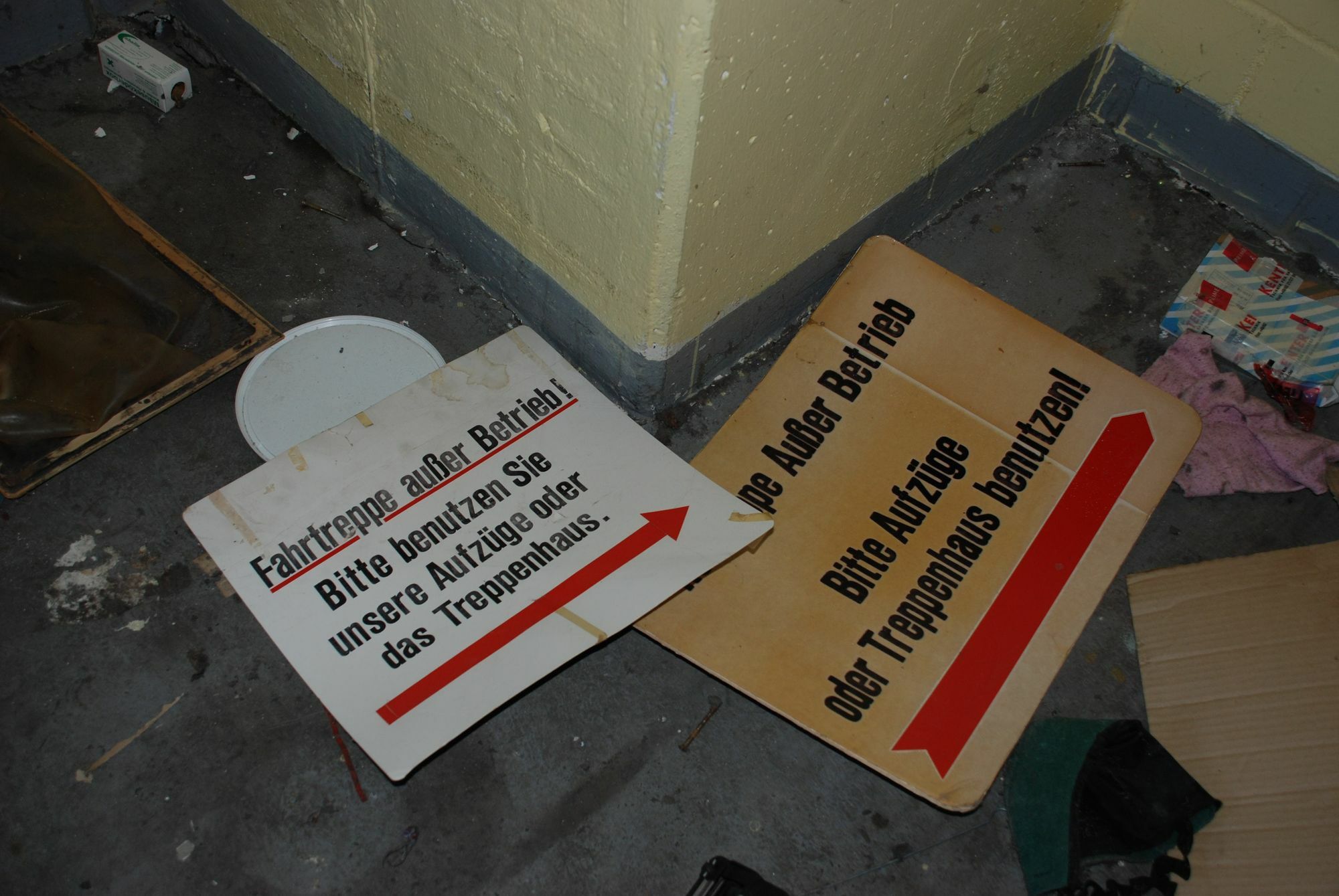 Über den Personaleingang geht es hinein. Drinnen ist es nahezu genauso kalt wie draußen. Die Personalräume und Warenlager sind riesig und verwinkelt. Es gibt keinen Strom. Wir gehen lange, dunkle Flure entlang, spähen in jeden Raum. Was sofort auffällt, ist das Chaos, das hier herrscht. Müll, Möbel, Akten, Computer und Bauteile liegen verstreut auf dem Fußboden, es ist dreckig. Zwischendrin Scherben, Schuhe, Winterschlussverkaufswerbung von 1998, ein orangefarbenes Telefon mit Wählscheibe. Sogar alte Personalakten. Die Atmosphäre ist gespenstisch bis gruselig, ich fühle mich zuweilen an einen Zombie-Apokalypse-Horrorfilm erinnert.