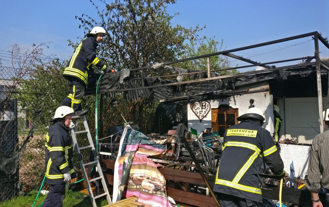 Unter einer Überdachung neben einem Gartenhaus brach am Samstag gegen 14.45 Uhr ein Feuer aus und erfasste schnell das Dach und die aus Holz bestehenden Teile. Eine dunkle Rauchsäule stieg in den Himmel. Zwei Kleingartenbesitzer bekämpften mit je einem Gartenschlauch das Feuer und ließen die Feuerwehr herbeirufen. Der angerückte Löschbezirk Süd rückte in den betroffenen Garten nahe der John-F.-Kennedy-Str. ein und kümmerte sich mit den vorhandenen Gartenschläuchen um kleinere Nachlöscharbeiten. Teile des verbrannten Daches wurden entfernt, die verbrannten Gegenstände ausgeräumt und gründlich abgelöscht. "Nur durch das beherzte Eingreifen der beiden Kleingärtner konnte ein Übergreifen der Flammen auf das Gartenhaus verhindert werden. Sie haben genau richtig gehandelt. Zuerst die Feuerwehr alarmiert und dann gefahrlos selbst Löschmaßnahmen durchgeführt", lobte Einsatzleiter Jeffrey Mitchel. Foto: Freiwillige Feuerwehr Bad Kreuznach