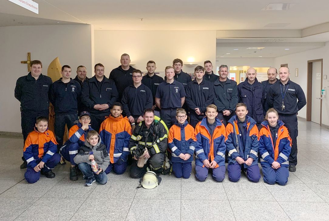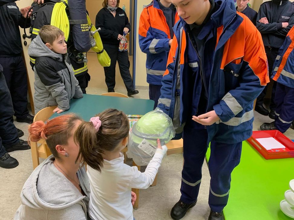 Den Kindern wurde die Einsatzausrüstung eines Feuerwehrmannes mit Atemschutzgerät gezeigt und erklärt. Insbesondere die Atemgeräusche des Lungenautomaten eines Atemschutzgerätes wurde den Kindern vorgeführt, damit sie davor keine Angst haben, falls sie einmal gesucht werden sollten. Den Kindern wurde zudem gezeigt, welche Einsätze bei der Feuerwehr anfallen und wie diese alarmiert wird. Dabei wurden die beiden Notrufnummern 110 für die Polizei und 112 für Feuerwehr und Rettungsdienst abgefragt. Sie durften durch die Wärmebildkamera schauen und ein Strahlrohr bedienen. Zudem stellten sie viele Frage zur Ausrüstung und den Feuerwehrfahrzeugen. Besonders freuten sich die Kinder über den von den Kameraden überreichten Feuerwehrhelm und die Süßigkeitentüte.