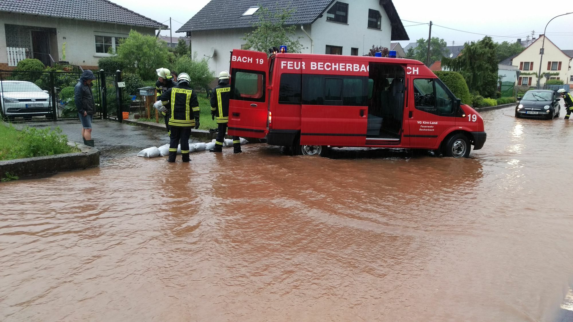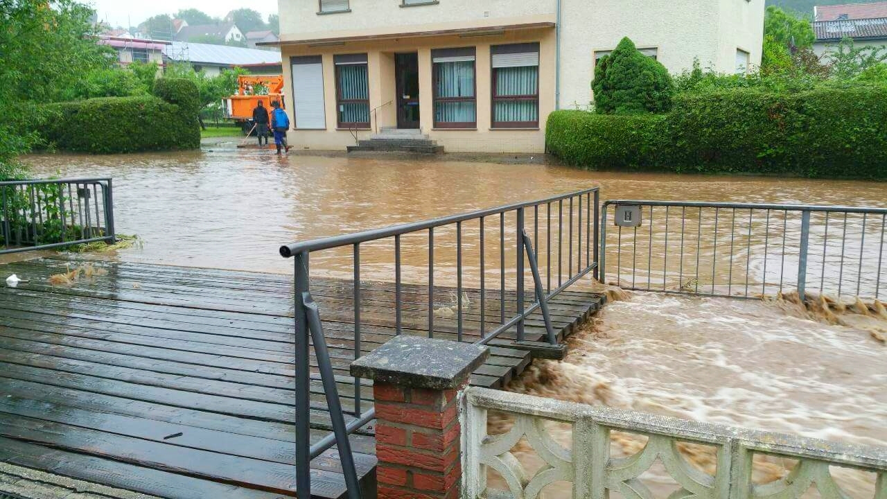 Große Niederschlagsmengen im deutlich zweistelligen Bereich sorgten über Nacht aktuell für über 200 Einsätze der Feuerwehren, des Technischen Hilfswerks und des Deutschen Roten Kreuzes im ganzen Landkreis Bad Kreuznach. Aktuell sind rund 60 Ortsfeuerwehren im Einsatz. Besonders schwer betroffen ist die Ortslage Hochstätten. Dort stehen mehrere Häuser unter Wasser, wobei ein Gebäude teilweise unterspült ist. Zusätzlich sind die Straßen in der Ortslage durch Überflutung unpassierbar. Bei Fürfeld ist die Bundesstraße 420 überflutet. In Winterbach stehen die Straßen ebenfalls unter Wasser. Aktuell sind alle Verbandsgemeinden im Unwettereinsatz.