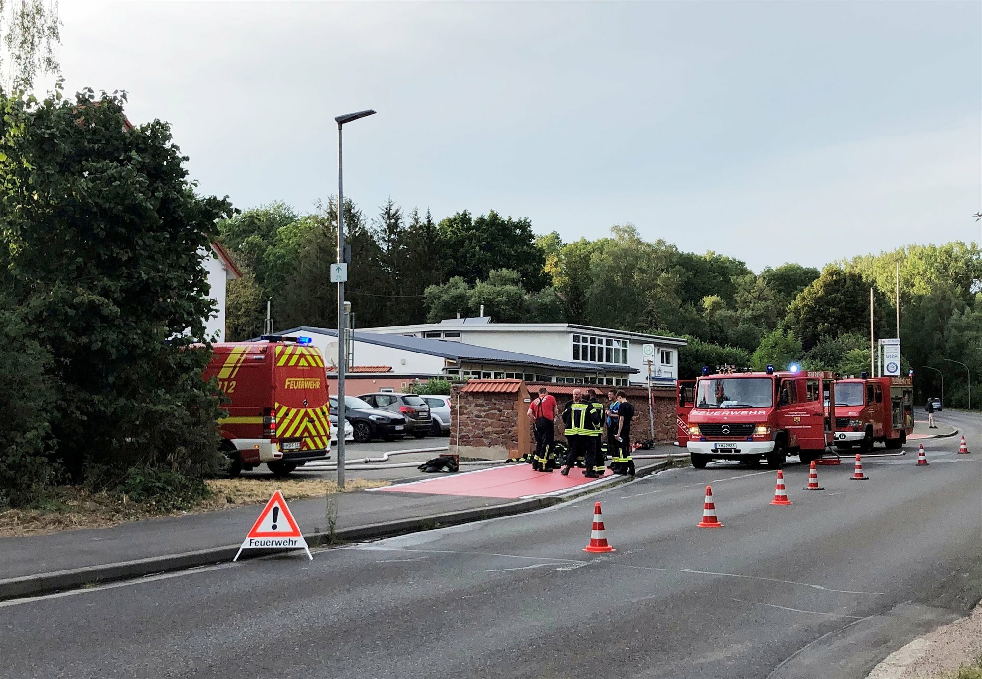 Der Feuerwehrmann führte den Jungen aus dem Haus und hinderte ihn daran, wieder ins Gebäude zurückzugehen. Die beiden Wehren aus Hargesheim-Roxheim und Rüdesheim waren schnell am Einsatzort, zu diesem Zeitpunkt schlugen aus mehreren Fenstern des Obergeschosses hohe Flammen. Mehrere Angriffstrupps unter Atemschutz bekämpften im Innen- und Außenangriff den ausgedehnten Brand. Zusätzlich wurden Belüftungsmaßnahmen eingeleitet, um den Kräften im Innern die Sicht zu verbessern. Um eine Brandausbreitung auf das Dach und die weiteren Reihenhäuser zu verhindern, wurden weitere Kräfte nachalarmiert, unter anderem auch eine Drehleiter des Kreuznacher Löschbezirks Nord. Die Einsatzkräfte kontrollierten über den Hubretter die weiteren Gebäude des Reihenhauskomplexes. Durch den schnellen und gezielten Einsatz der Wehren konnte das Feuer auf das Brandobjekt begrenzt werden.