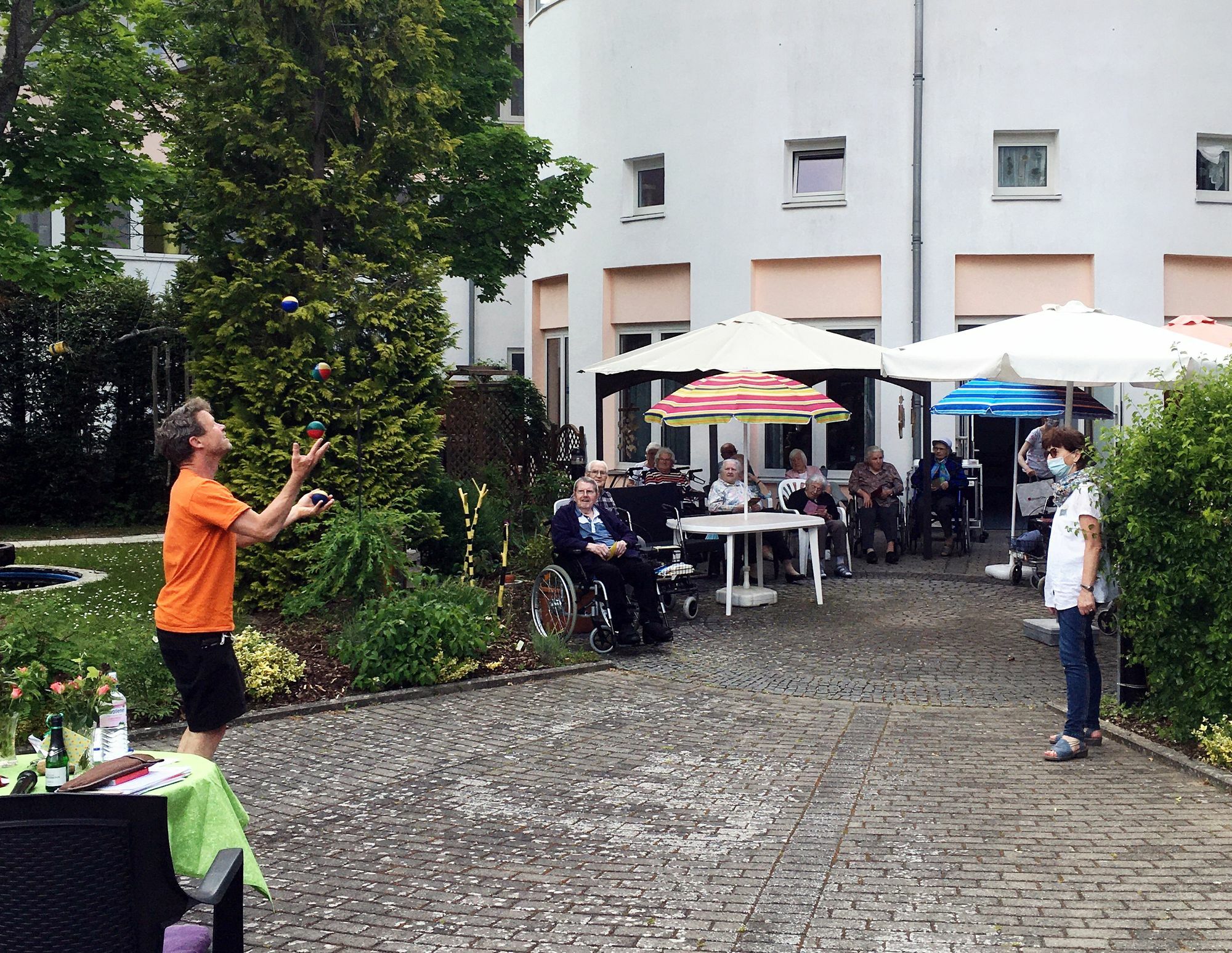 Über 70 verschiedene individuelle und wunderschöne Kartengrüße von den beiden Kindertagesstätten in Bad Münster am Stein-Ebernburg, von Gabriele Rauth und Ursula Wendling aus dem Organisationsteam der Begegnungsstätte, aber auch richtig lange selbstgeschriebene Briefe von Bürgerinnen und Bürgern des Stadtteils und der Stadt konnten in der Begegnungsstätte Vielfalt gesammelt werden. Einen Großteil der Karten konnte Marlene Jänsch jüngst anlässlich eines kleinen aber besonderen Ereignisses im St. Antoniushaus übergeben. Hubertus von Putlitz, der Gaukler aus Altenbamberg und gern gesehener Gast auch in der Begegnungsstätte Vielfalt ist, zeigte mit Jonglierbällen, Keulen und Reifen sein professionelles Können. Die begeisterten Zuschauerinnen und Zuschauer belohnten die Darbietungen mit viel Applaus. Dazu sang und musizierte er zusammen mit Marlene Jänsch Volks- und Mailieder. Trotz großem Abstand und ohne Texte konnten die Bewohner und Bewohnerinnen des Seniorenheimes mit den beiden Gästen gemeinsam einen sehr harmonischen Nachmittag verbringen. Der Innenhof des St. Antoniushauses der Franziskanerbrüder vom Heiligen Kreuz bietet neben der sommerlichen Kulisse eine wunderbare Akustik. Zum Abschluss wurde die Post verteilt und man sah nur noch glückliche und lächelnde Gesichter.