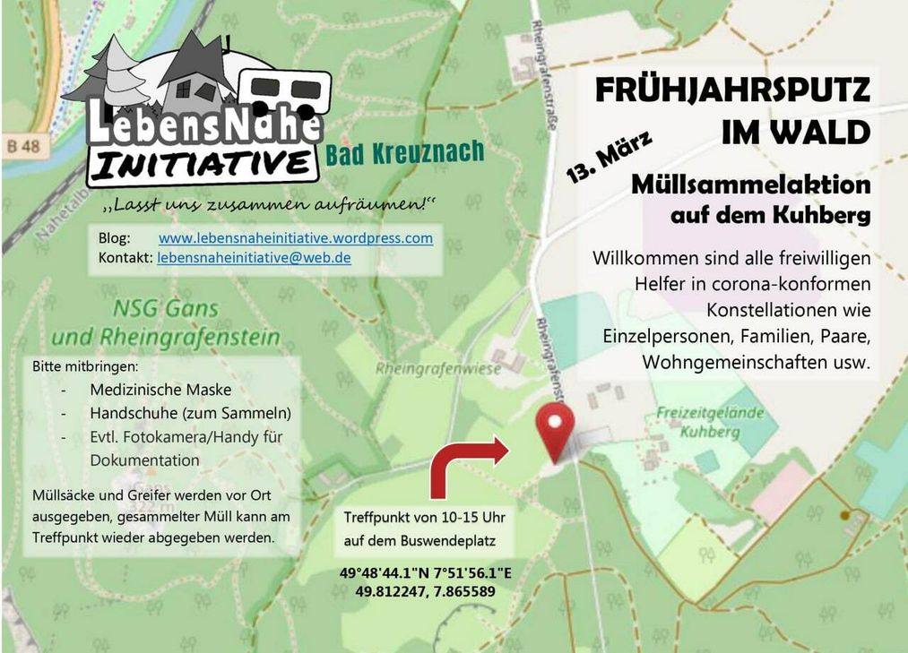 Der Frühjahrsputz findet rund um das Freizeitgelände Kuhberg und im Wald statt. Auf dem angrenzenden Buswendeplatz wird eine Sammelstation eingerichtet, an welcher der gesammelte Müll abgeben werden kann. Außerdem können dort Müllsäcke, Greifer, Eimer und Einweghandschuhe geliehen werden. Los geht die Aktion am Samstag ab 10 Uhr auf dem Buswendeplatz neben dem Freizeitgelände Kuhberg Bad Kreuznach. Die Aktion endet gegen ca. 15 Uhr. Aufgrund der Coronapandemie wird darum gebeten sich an die zu dem Zeitpunkt gültigen Auflagen zu halten und den Anweisungen der Veranstalter zu folgen. Die Teilnehmer*Innen sammeln einzeln oder in Corona-konformen Konstellationen wie in zweier Teams, in der Familie oder mit der WG. Bitte bringt unbedingt eine medizinische Maske und Handschuhe mit. Außerdem wird dazu aufgerufen Fotos und Videos von dem Müll- und den Sammelstellen anzufertigen und nach der Aktion an die unten stehende E-Mail zu senden. Bildmaterial über die Müll-Hot-Spots werden von der LebensNahen Initiative dokumentiert und öffentlichkeitswirksam aufbereitet. Weitere Informationen rund um die Aktion online oder per Mail: https://lebensnaheinitiative.wordpress.com/ E-Mail: Lebensnaheinitiative@web.de