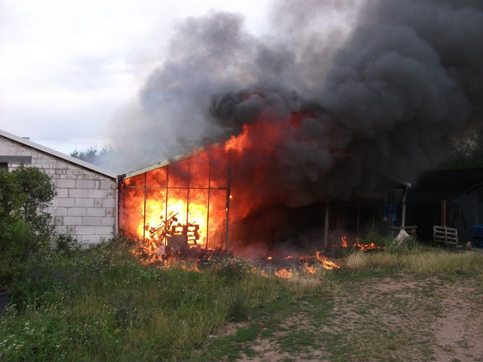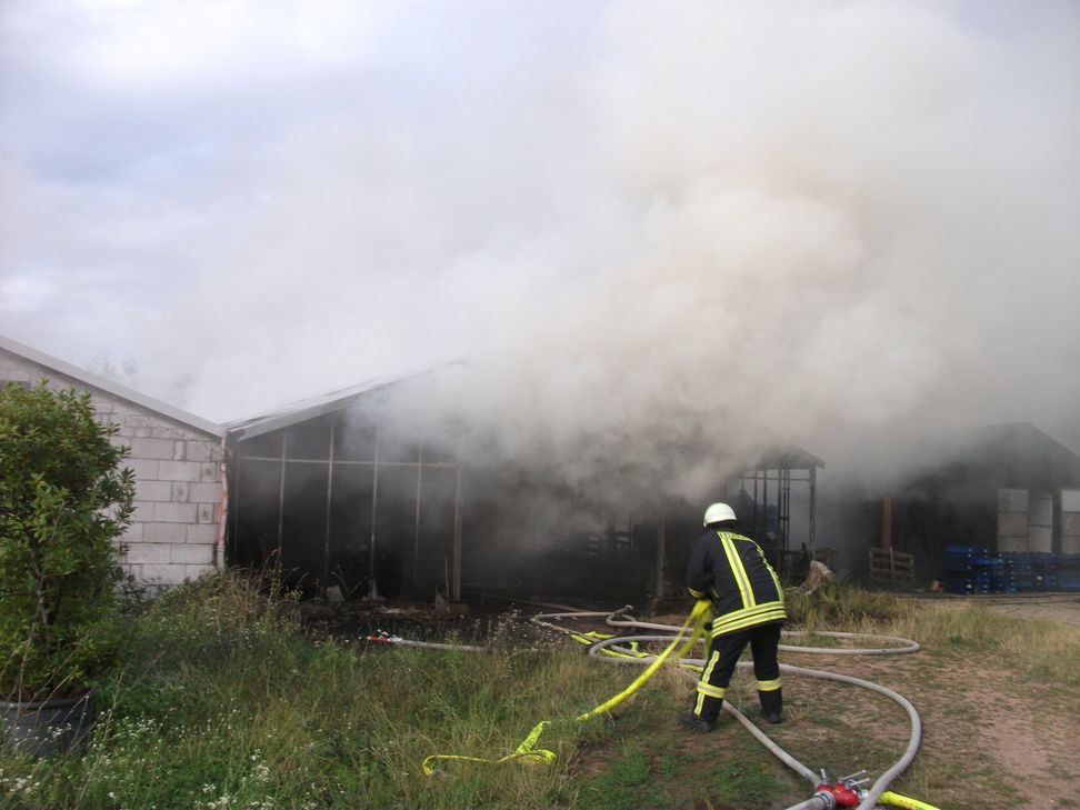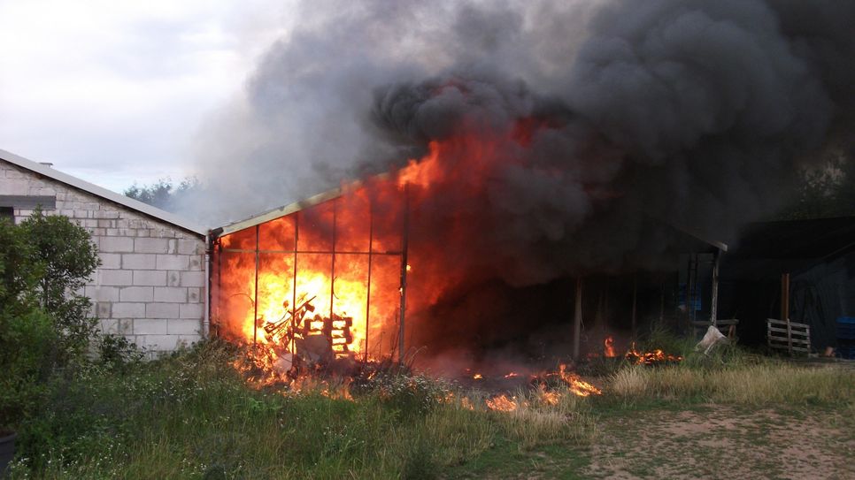 Bereits auf der Anfahrt wies eine schwarze Rauchsäule den Einsatzkräften den Weg zur Einsatzstelle in der Nähe des Ippesheimer Weihers. Ein ehemaliges Gewächshaus mit einer Größe von 10 m x 30 m, in dem etwa 70 Rundballen Heu und technisches Material gelagert wurden, stand in Vollbrand. Die Flammen schlugen seitlich und auf der Rückseite aus den zerborstenen Scheiben und drohten auf benachbarte Hallen und Wohnhäuser überzugreifen. Sofort wurde Vollalarm für alle 4 Löschbezirke der Stadt Bad Kreuznach ausgelöst. Den Ermittlungen der Brandspezialisten der Bad Kreuznacher Kriminalinspektion zufolge sind spielende Kinder für die Brandentstehung verantwortlich. Sie hatten zuvor in dem abgebrannten Gewächshaus Verstecken gespielt. Dabei zündelte ein dreizehnjähriges Kind mit einem Feuerzeug an einer Flüssigkeit, die anschließend Feuer fing, das sich rasend schnell ausbreitete. Die Kinder flüchteten daraufhin. Eine Anwohnerin bemerkte den Brandgeruch, leitete erste Löschversuche ein und alarmierte schließlich die Feuerwehr. Der entstandene Sachschaden dürfte insgesamt bei über 100.000 € liegen. Zur Brandbekämpfung: Es wurden 2 Einsatzabschnitte gebildet. Die Löschbezirke Ost und West bekämpften den Brand von der Ostseite der Halle und riegelten die Flammen zu den benachbarten Wohngebäuden und Garagen ab. Die Löschbezirke Süd und Nord nahmen die Brandbekämpfung von der Rückseite der Halle aus vor und verhinderten mit einer Riegelstellung ein Übergreifen der Flammen zur benachbarten Halle. Insgesamt wurden 7 C-Rohre und knapp 20 Trupps unter schwerem Atemschutz nacheinander eingesetzt, um den Brand zu löschen. Ein Übergreifen der Flammen auf Nachbargebäude konnte durch das rasche Eingreifen der Wehrleute verhindert werden. 7 Personen erlitten Rauchvergiftung. Davon mussten 4 Personen (darunter ein Kleinkind) zur weiteren Untersuchung in ein Krankenhaus gebracht werden. 2 Feuerwehrleute verletzten sich leicht, konnten aber ihren Dienst vor Ort nach kurzer Behandlung durch den Rettungsdienst, der mit einem Großaufgebot angerückt war, wieder fortsetzen. Etwa 50.000 l Wasser und 260 l Schaummittel, das als Netzmittel dem Löschwasser beigemischt wurde, wurden zur Brandbekämpfung eingesetzt. Mit einem Radlader wurden die brennenden Heuballen aus der Halle geholt und auf eine Wiese gefahren. Dort wurden sie gründlich abgelöscht. Das Wohnhaus war leicht verraucht und wurde durch die Einsatzkräfte mit einem Belüftungsgerät entraucht.