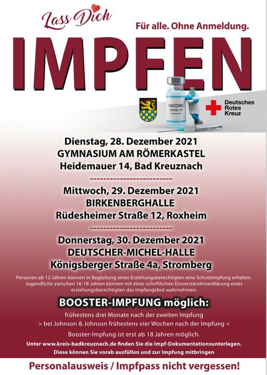 In der Zeit zwischen Weihnachten und Silvester wird das Impfangebot von DRK-Kreisverband und Kreisverwaltung Bad Kreuznach fortgesetzt, und zwar am Dienstag, Mittwoch und Donnerstag, 28. bis 30. Dezember.