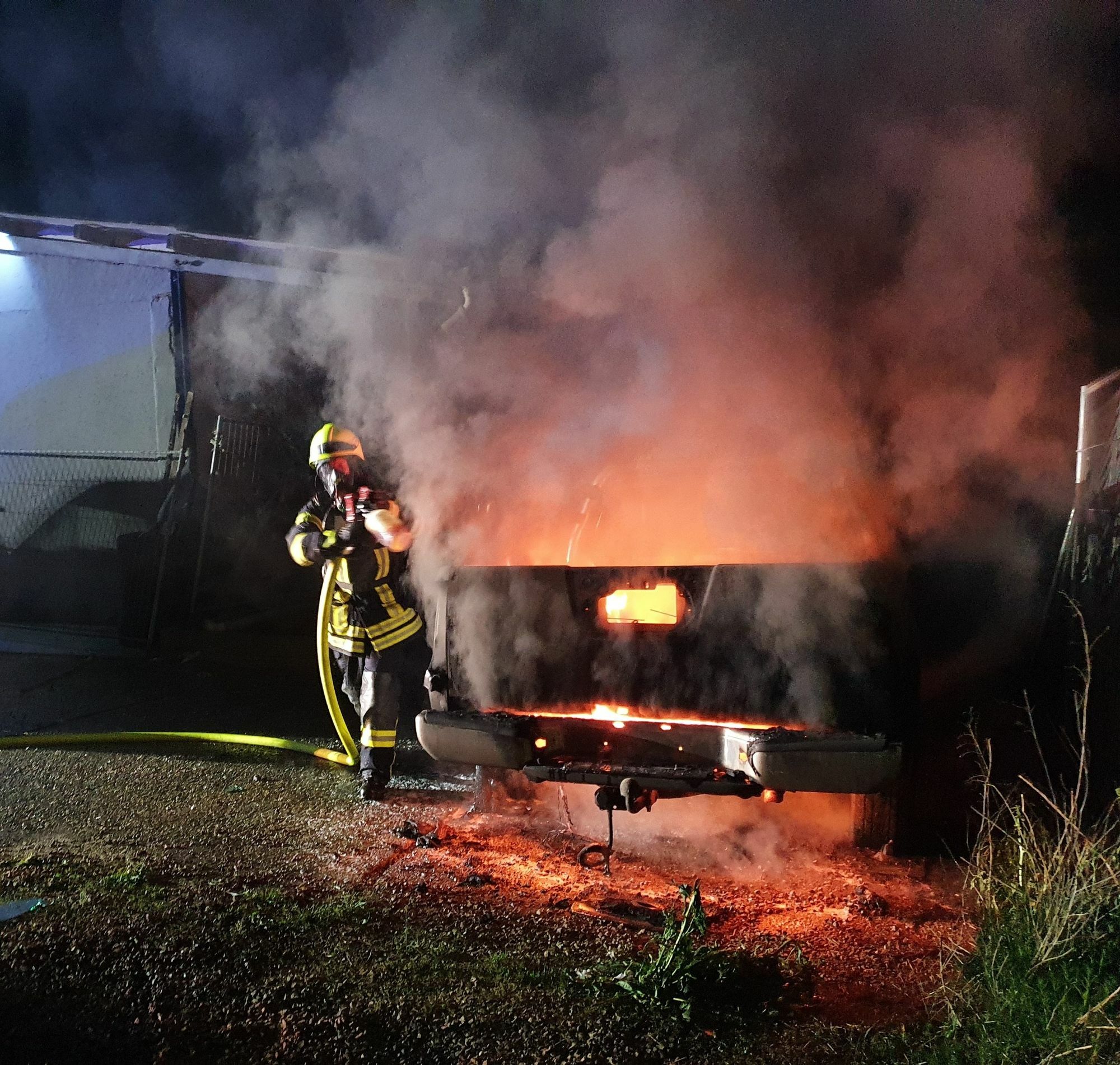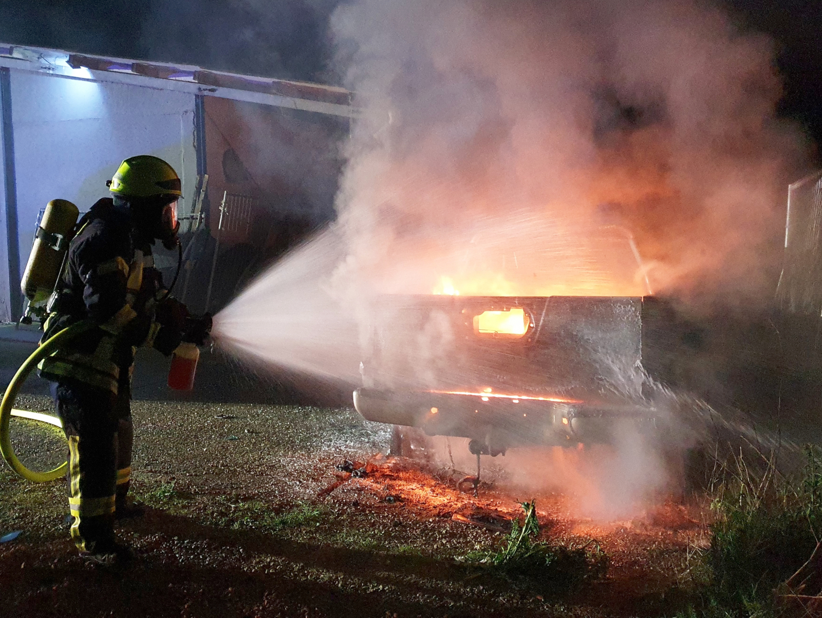Da die Gefahr bestand, dass sich der Brand auf die Halle ausbreitet, forderte die Hüffelsheimer Wehr zusätzliche Kräfte der Rüdesheimer Wehr mit einem weiteren Löschfahrzeug nach und nahm sofort ein C-Rohr zum Schutz der Halle vor. Nachdem das Tanklöschfahrzeug eingetroffen war, konnte mit der Brandbekämpfung des Geländewagens und der ebenfalls in Brand geratenen Vegetation begonnen werden. Hierzu kamen zwei Atemschutztrupps aus Hüffelsheim und Rüdesheim zum Einsatz. Die Einsatzstelle wurde ausgeleuchtet. Während der Löscharbeiten war die Landesstraße 108 im Bereich des Marienhofs gesperrt. Dank des schnellen Eingreifens der Hüffelsheimer Wehr konnte eine Ausbreitung des Feuers auf die Halle erfolgreich verhindert werden. Die Brandursache ist bislang nicht bekannt, die Polizei Bad Kreuznach hat die Ermittlungen aufgenommen. Die Höhe des Sachschadens ist nicht bekannt, der Geländewagen brannte jedoch vollkommen aus. Der Einsatz unter der Leitung des stellvertretenden VG-Wehrleiters Jörn Trautmann konnte gegen 23.45 Uhr beendet werden. Fotos: Feuerwehr VG Rüdesheim